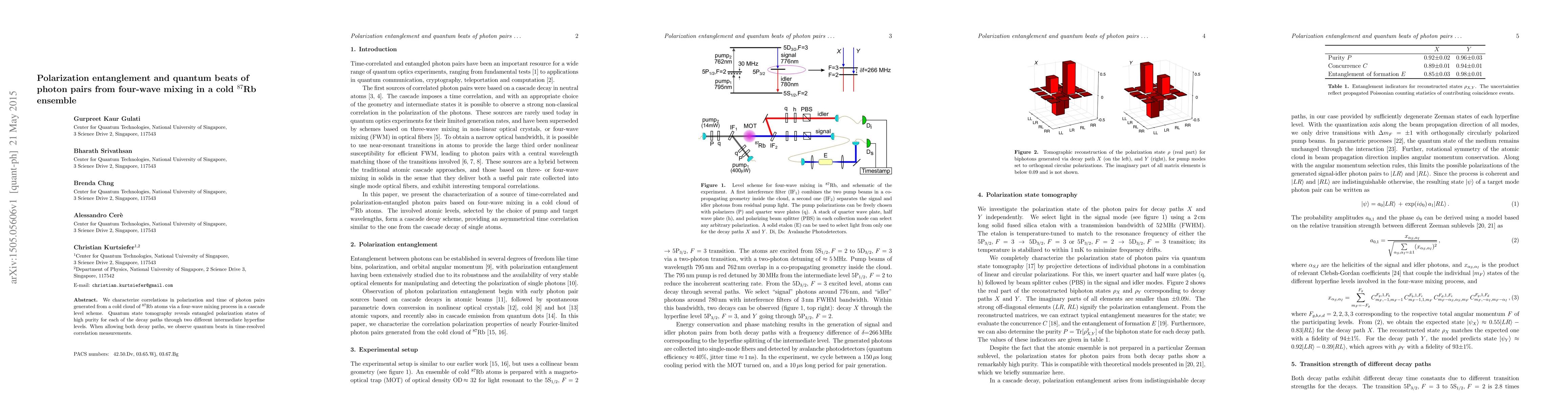 This paper investigates photon pairs generated from a cold Rb-87 ensemble via four-wave mixing, revealing high-purity polarization entanglement through quantum state tomography. Quantum beats are observed in time-resolved correlation measurements when both decay paths are considered.