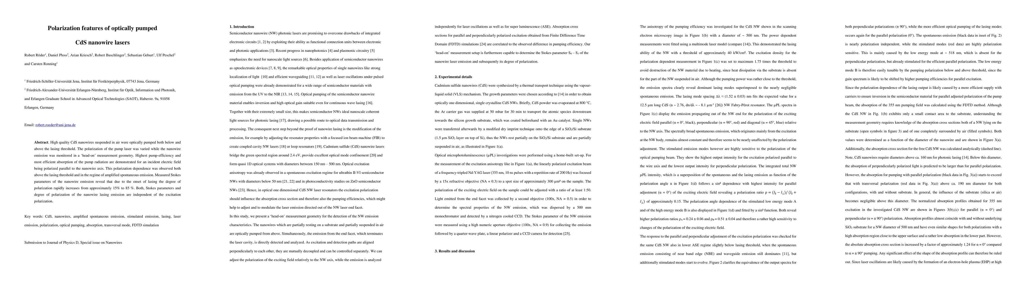 This study investigates the polarization features of optically pumped CdS nanowire lasers, revealing that the highest pump efficiency and absorption occur when the pump laser's electric field is polarized parallel to the nanowire axis. The degree of polarization of the lasing emission increases significantly with the onset of lasing, but remains independent of the excitation polarization.