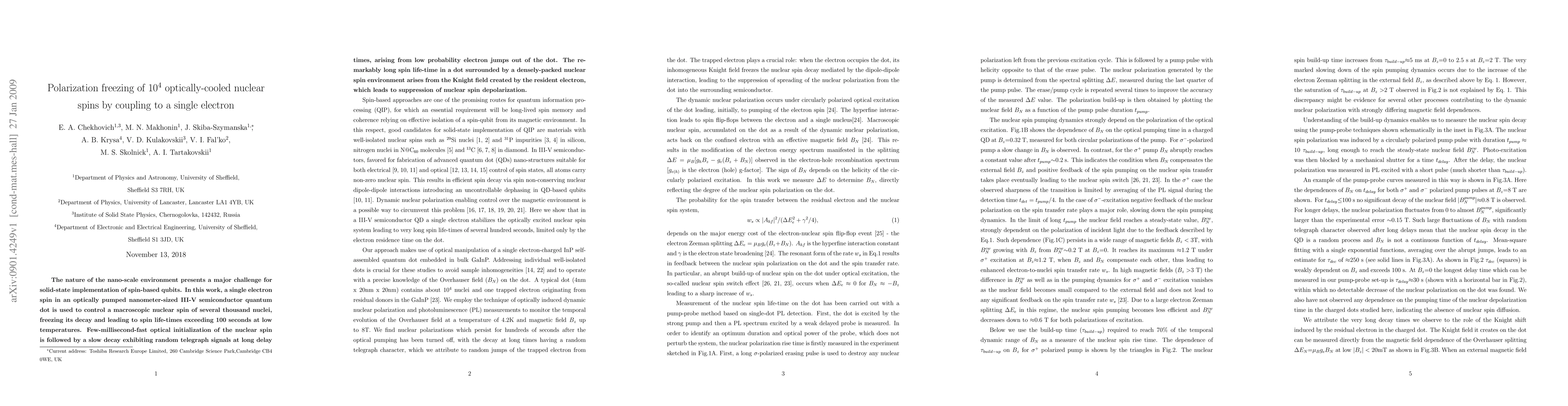 The nature of the nano-scale environment presents a major challenge for solid-state implementation of spin-based qubits. In this work, a single electron spin in an optically pumped nanometer-sized III-V semiconductor quantum dot is used to control a macroscopic nuclear spin of several thousand nuclei, freezing its decay and leading to spin life-times exceeding 100 seconds at low temperatures. Few-millisecond-fast optical initialization of the nuclear spin is followed by a slow decay exhibiting random telegraph signals at long delay times, arising from low probability electron jumps out of the dot. The remarkably long spin life-time in a dot surrounded by a densely-packed nuclear spin environment arises from the Knight field created by the resident electron, which leads to suppression of nuclear spin depolarization.