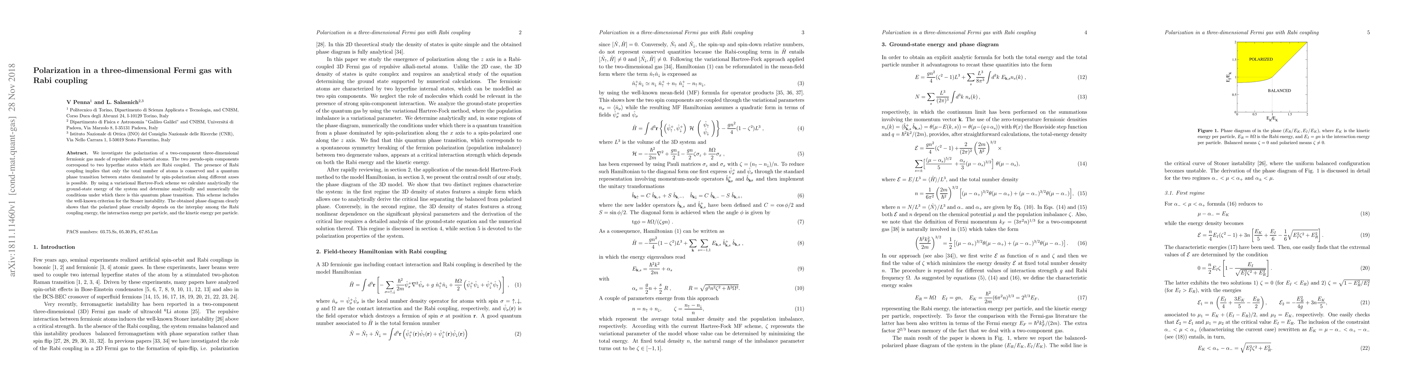 We investigate the polarization of a two-component three-dimensional fermionic gas made of repulsive alkali-metal atoms. The two pseudo-spin components correspond to two hyperfine states which are Rabi coupled. The presence of Rabi coupling implies that only the total number of atoms is conserved and a quantum phase transition between states dominated by spin-polarization along different axses is possible. By using a variational Hartree-Fock scheme we calculate analytically the ground-state energy of the system and determine analytically and numerically the conditions under which there is this quantum phase transition. This scheme includes the well-known criterion for the Stoner instability. The obtained phase diagram clearly shows that the polarized phase crucially depends on the interplay among the Rabi coupling energy, the interaction energy per particle, and the kinetic energy per particle.
