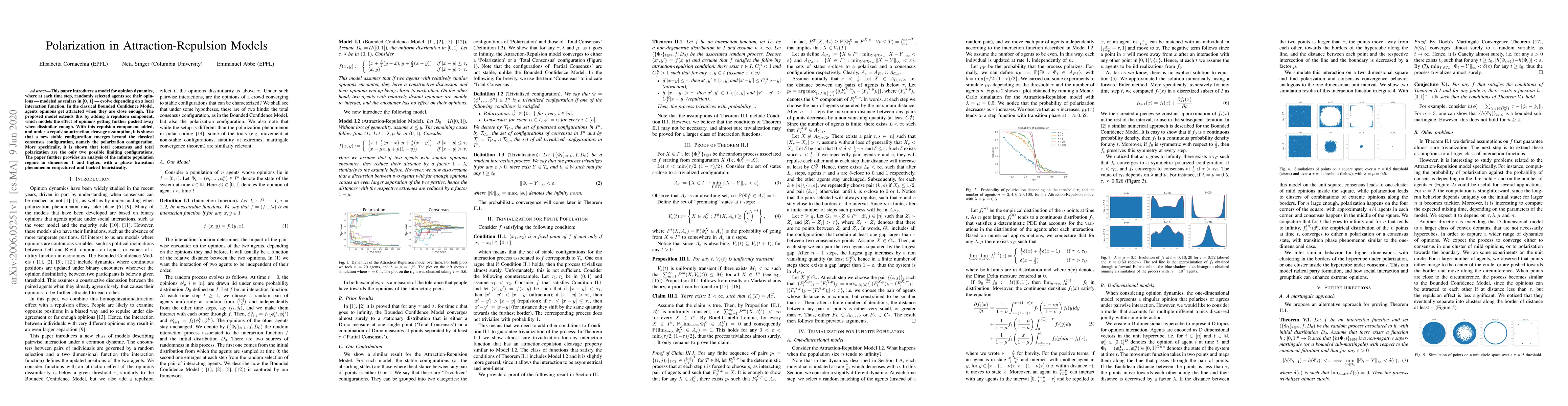 This paper proposes a new opinion dynamics model that incorporates both attraction and repulsion between agents' opinions, leading to either consensus or polarization as stable configurations. It demonstrates a phase transition phenomenon in the infinite population regime, suggesting a conjectured critical point.