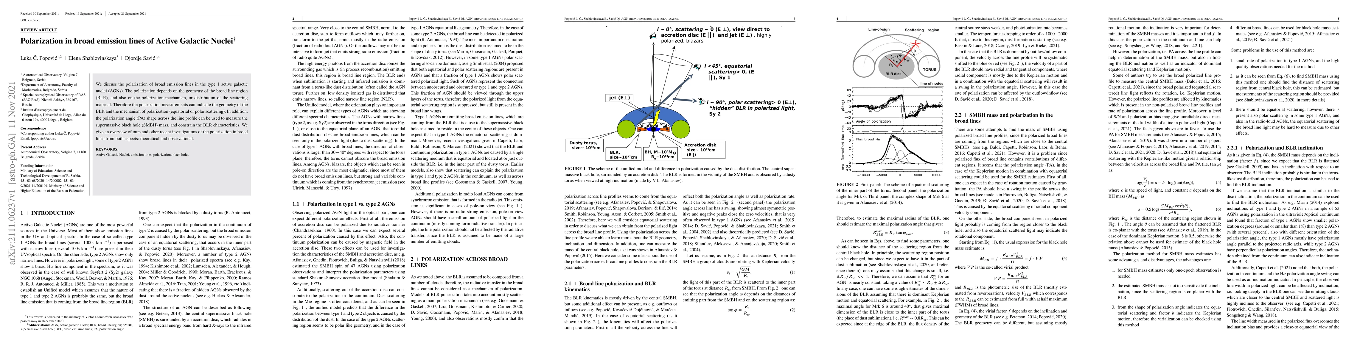 This paper examines the polarization of broad emission lines in type 1 active galactic nuclei (AGNs), linking polarization to the geometry of the broad line region (BLR) and the scattering material's distribution. The study uses polarization measurements to infer BLR geometry and polarization mechanisms, and analyzes the polarization angle shape to estimate supermassive black hole mass and BLR characteristics.