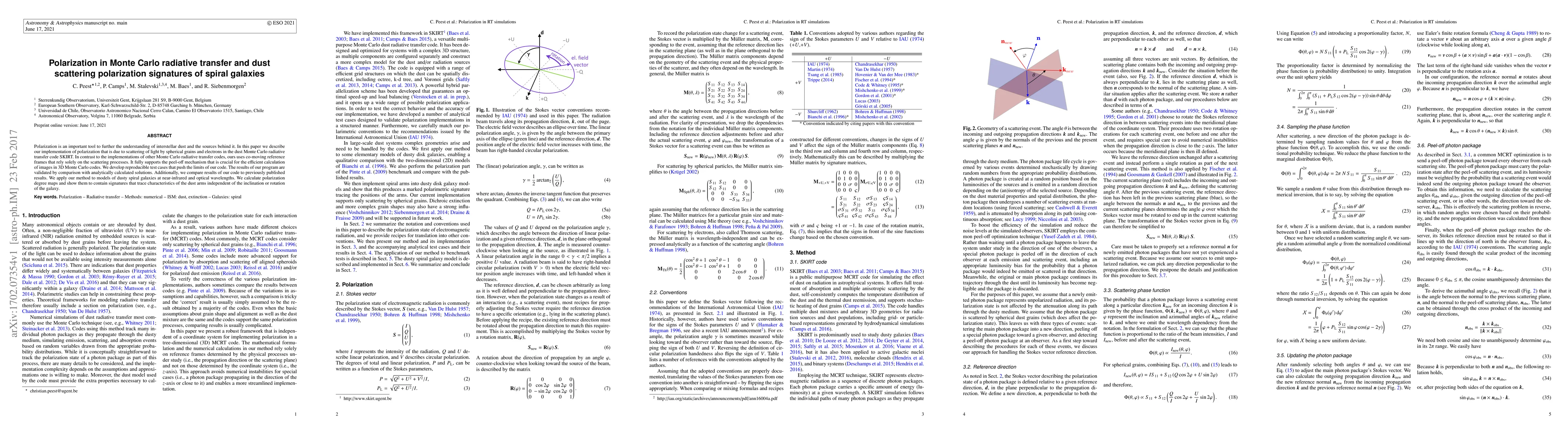 Polarization is an important tool to further the understanding of interstellar dust and the sources behind it. In this paper we describe our implementation of polarization that is due to scattering of light by spherical grains and electrons in the dust Monte Carlo radiative transfer code SKIRT. In contrast to the implementations of other Monte Carlo radiative transfer codes, ours uses co-moving reference frames that rely solely on the scattering processes. It fully supports the peel-off mechanism that is crucial for the efficient calculation of images in 3D Monte Carlo codes. We develop reproducible test cases that push the limits of our code. The results of our program are validated by comparison with analytically calculated solutions. Additionally, we compare results of our code to previously published results. We apply our method to models of dusty spiral galaxies at near-infrared and optical wavelengths. We calculate polarization degree maps and show them to contain signatures that trace characteristics of the dust arms independent of the inclination or rotation of the galaxy.