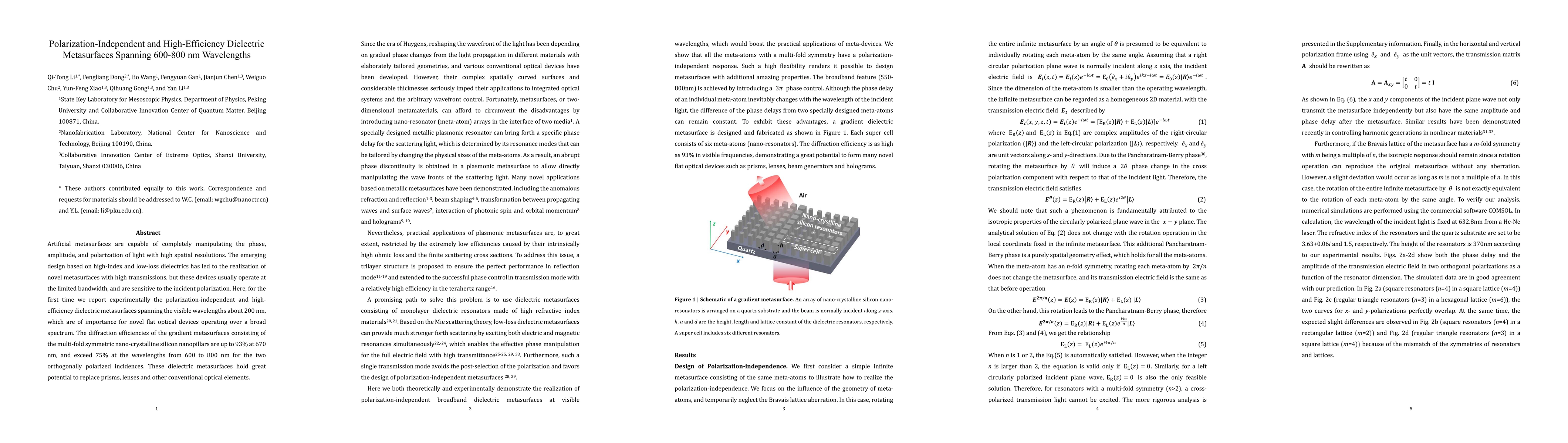 This paper presents polarization-independent and high-efficiency dielectric metasurfaces spanning 600-800 nm wavelengths, achieving diffraction efficiencies up to 93% at 670 nm and exceeding 75% across the spectrum for both polarizations, demonstrating potential to replace conventional optical elements.