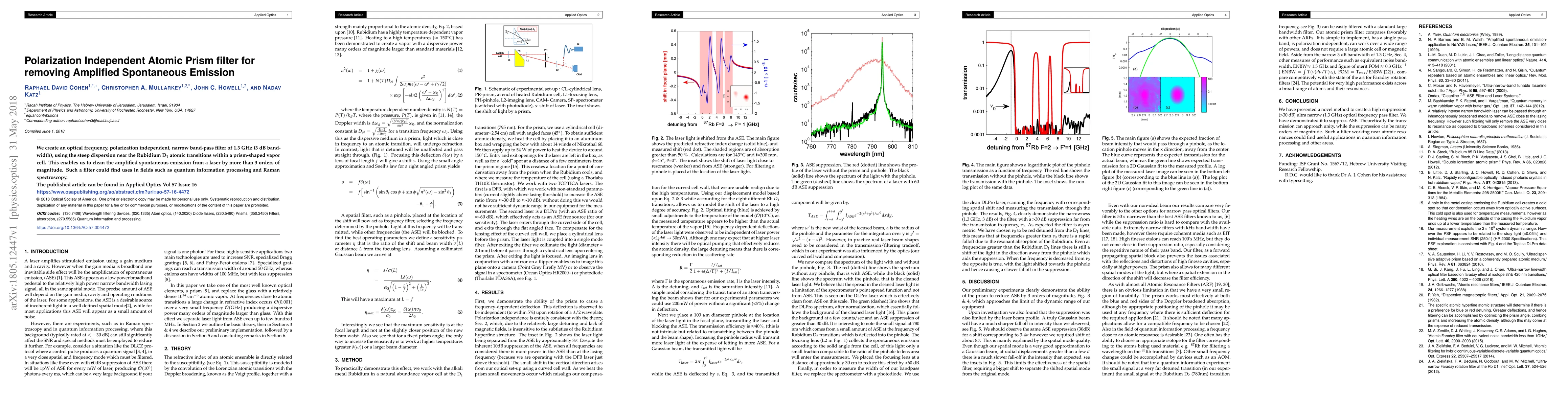 This paper presents a polarization-independent, narrow-band atomic prism filter with a 1.3 GHz bandwidth, designed to remove amplified spontaneous emission from lasers by over 3 orders of magnitude, utilizing steep dispersion near Rubidium D1 transitions. Potential applications include quantum information processing and Raman spectroscopy.