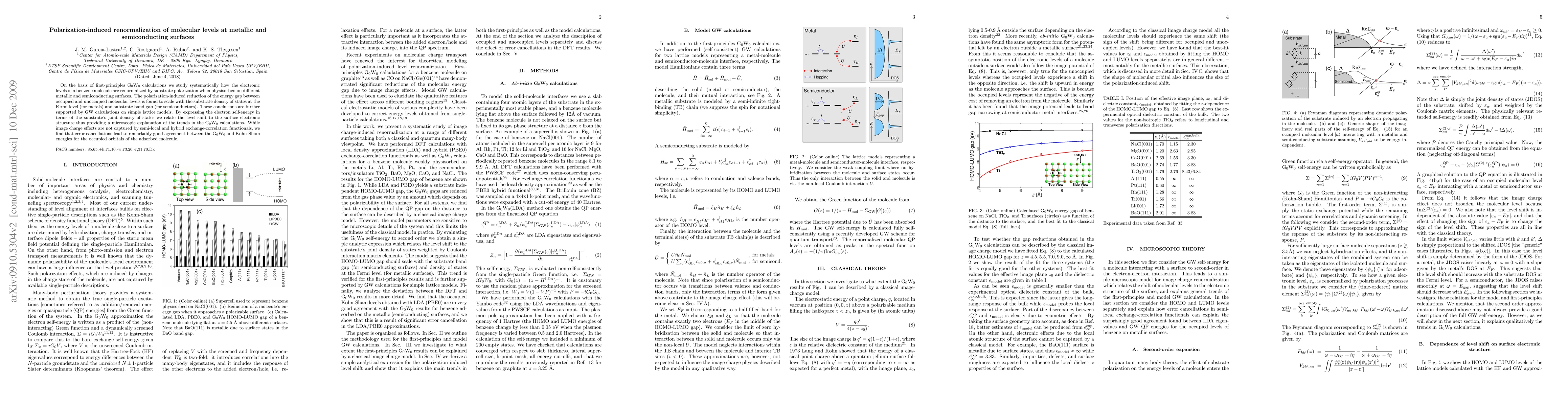 This research investigates how the electronic levels of benzene molecules change when adsorbed on metallic and semiconducting surfaces, finding that the energy gap reduction correlates with substrate density of states and band gap. The study provides a microscopic explanation linking the level shift to the surface electronic structure.
