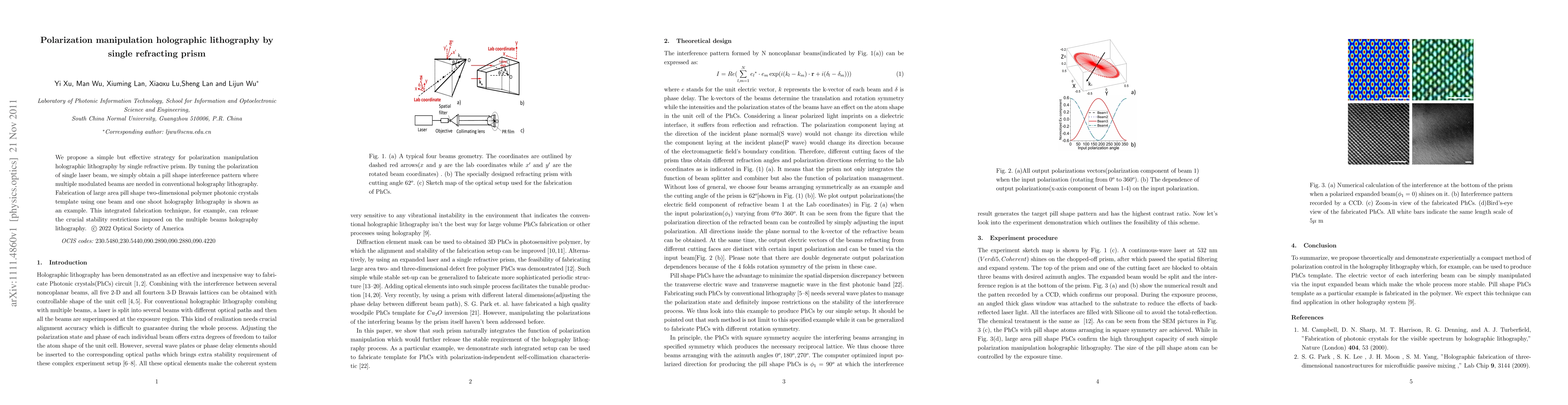 This paper proposes a novel polarization manipulation technique using a single refractive prism for holographic lithography, enabling the creation of pill shape interference patterns with a single laser beam instead of multiple modulated beams. This method facilitates the fabrication of large-area polymer photonic crystals, overcoming stability issues inherent in conventional multi-beam holography.