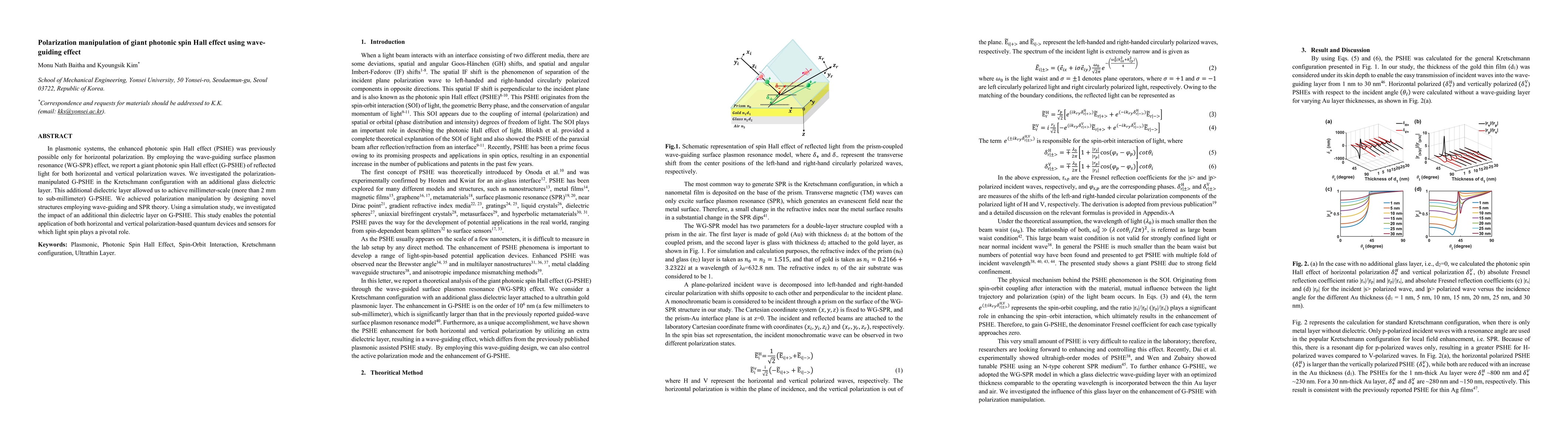 In plasmonic systems, the enhanced photonic spin Hall effect (PSHE) was previously possible only for horizontal polarization. By employing the wave-guiding surface plasmon resonance (WG-SPR) effect, we report a giant photonic spin Hall effect (G-PSHE) of reflected light for both horizontal and vertical polarization waves. We investigated the polarization-manipulated G-PSHE in the Kretschmann configuration with an additional glass dielectric layer. This additional dielectric layer allowed us to achieve millimeter-scale (more than 2 mm to sub-millimeter) G-PSHE. We achieved polarization manipulation by designing novel structures employing wave-guiding and SPR theory. Using a simulation study, we investigated the impact of an additional thin dielectric layer on G-PSHE. This study enables the potential application of both horizontal and vertical polarization-based quantum devices and sensors for which light spin plays a pivotal role.