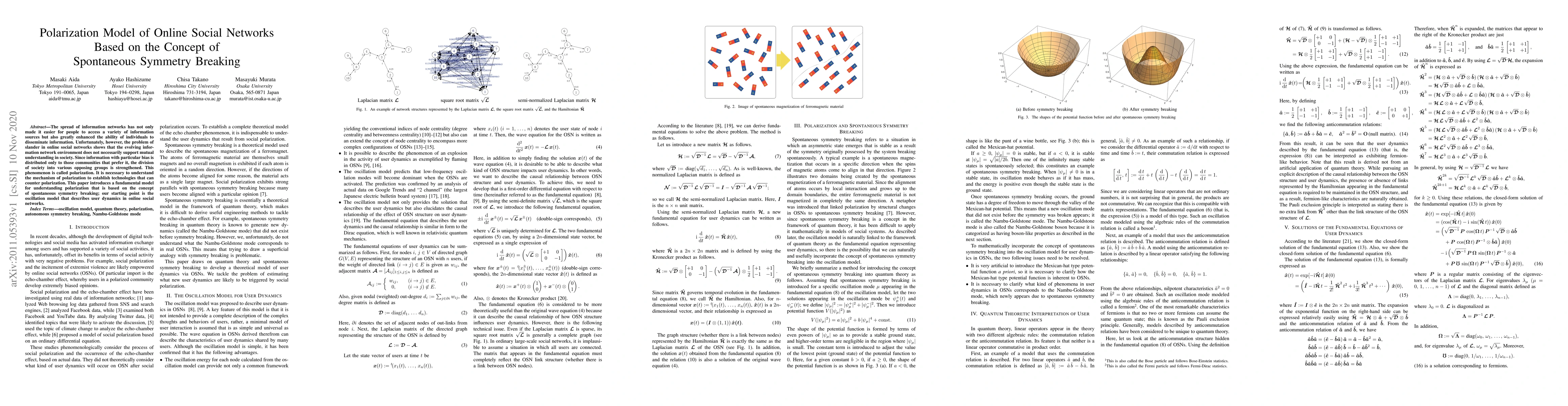 The spread of information networks has not only made it easier for people to access a variety of information sources but also greatly enhanced the ability of individuals to disseminate information. Unfortunately, however, the problem of slander in online social networks shows that the evolving information network environment does not necessarily support mutual understanding in society. Since information with particular bias is distributed only to those communities that prefer it, the division of society into various opposing groups is strengthened. This phenomenon is called polarization. It is necessary to understand the mechanism of polarization to establish technologies that can counter polarization. This paper introduces a fundamental model for understanding polarization that is based on the concept of spontaneous symmetry breaking; our starting point is the oscillation model that describes user dynamics in online social networks.