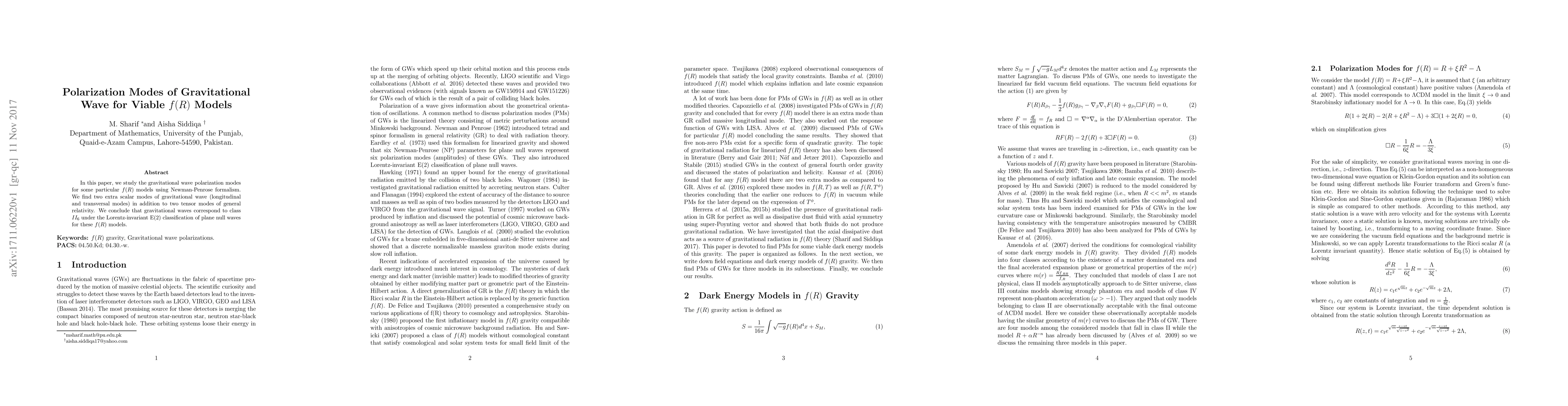 This paper explores gravitational wave polarization modes in viable $f(R)$ models using the Newman-Penrose formalism, identifying two additional scalar modes alongside the standard tensor modes, classifying the waves as $II_{6}$ under the Lorentz-invariant E(2) classification.