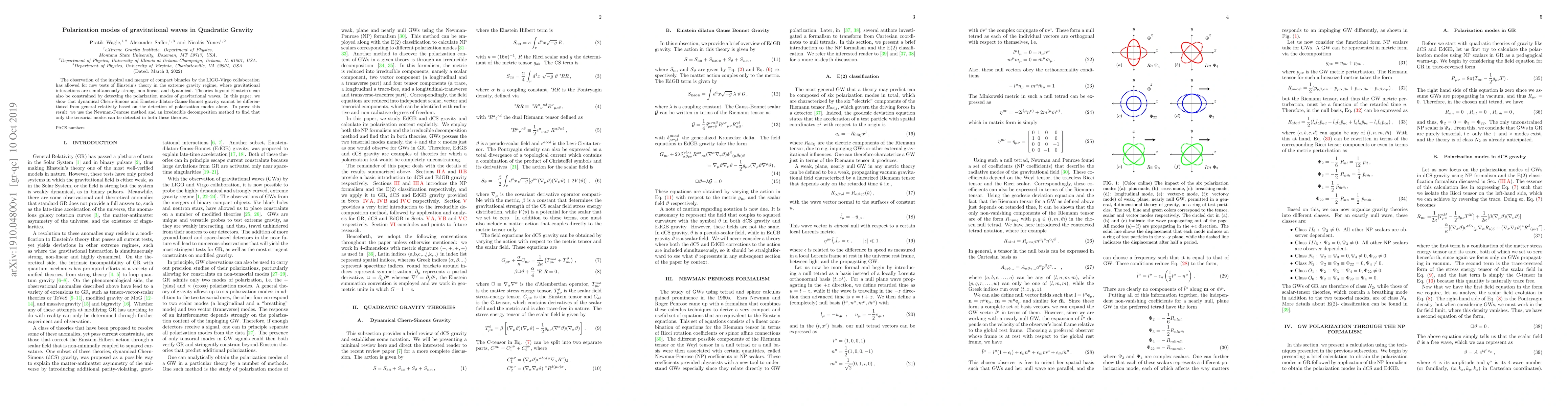 This paper investigates the polarization modes of gravitational waves in quadratic gravity theories, showing that dynamical Chern-Simons and Einstein-dilaton-Gauss-Bonnet gravity cannot be distinguished from general relativity based on polarization detection alone, as only tensorial modes are detectable.