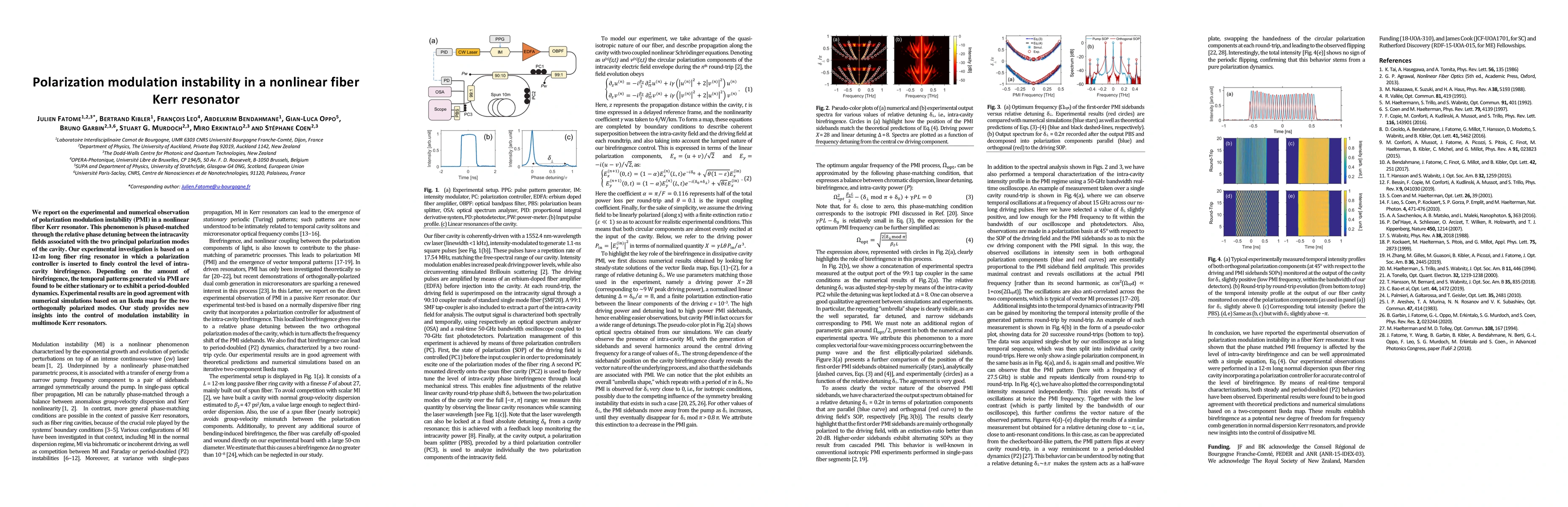 We report on the experimental and numerical observation of polarization modulation instability (PMI) in a nonlinear fiber Kerr resonator. This phenomenon is phased-matched through the relative phase detuning between the intracavity fields associated with the two principal polarization modes of the cavity. Our experimental investigation is based on a 12-m long fiber ring resonator in which a polarization controller is inserted to finely control the level of intra-cavity birefringence. Depending on the amount of birefringence, the temporal patterns generated via PMI are found to be either stationary or to exhibit a period-doubled dynamics. Experimental results are in good agreement with numerical simulations based on an Ikeda map for the two orthogonally polarized modes. Our study provides new insights into the control of modulation instability in multimode Kerr resonators. Modulation instability (MI) is a nonlinear phenomenon characterized by the exponential growth and evolution of periodic perturbations on top of an intense continuous-wave (cw) laser beam [1, 2]. Underpinned by a nonlinearly phase-matched parametric process, it is associated with a transfer of energy from a narrow pump frequency component to a pair of sidebands arranged symmetrically around the pump. In single-pass optical fiber propagation, MI can be naturally phase-matched through a balance between anomalous group-velocity dispersion and Kerr nonlinearity [1, 2]. In contrast, more general phase-matching conditions are possible in the context of passive Kerr resonators, such as fiber ring cavities, because of the crucial role played by the systems' boundary conditions [3-5]. Various configurations of MI have been investigated in that context, including MI in the normal dispersion regime, MI via bichromatic or incoherent driving, as well as competition between MI and Faraday or period-doubled (P2) instabilities [6--12]. Moreover, at variance with single-pass propagation, MI in Kerr resonators can lead to the emergence of stationary periodic (Turing) patterns; such patterns are now understood to be intimately related to temporal cavity solitons and microresonator optical frequency combs [13--16]. Birefringence, and nonlinear coupling between the polarization components of light, is also known to contribute to the phase-matching of parametric processes. This leads to polarization MI (PMI) and the emergence of vector temporal patterns [17-19]. In driven resonators, PMI has only been investigated theoretically so far [20-22], but recent demonstrations of orthogonally-polarized dual comb generation in microresonators are sparking a renewed interest in this process [23]. In this Letter, we report on the direct experimental observation of PMI in a passive Kerr resonator. Our experimental test-bed is based on a normally dispersive fiber ring cavity that incorporates a polarization controller for adjustment of the intra-cavity birefringence. This localized birefringence gives rise to a relative phase detuning between the two orthogonal polarization modes of the cavity, which in turn affects the frequency shift of the PMI sidebands. We also find that birefringence can lead to period-doubled (P2) dynamics, characterized by a two round-trip cycle. Our experimental results are in good agreement with theoretical predictions and numerical simulations based on an iterative two-component Ikeda map. The experimental setup is displayed in Fig. 1(a). It consists of a L = 12-m long passive fiber ring cavity with a finesse F of about 27, mainly built out of spun fiber. To avoid competition with scalar MI [2], we have built a cavity with normal group-velocity dispersion estimated to 2 = 47 ps 2 /km, a value large enough to neglect third-order dispersion. Also, the use of a spun fiber (nearly isotropic) avoids group-velocity mismatch between the polarization components. Additionally, to prevent any additional source of bending-induced birefringence, the fiber was carefully off-spooled and wound directly on our experimental board with a large 50-cm diameter. We estimate that this causes a birefringence $\Delta$n no greater than 10 --8 [24], which can be neglected in our study.