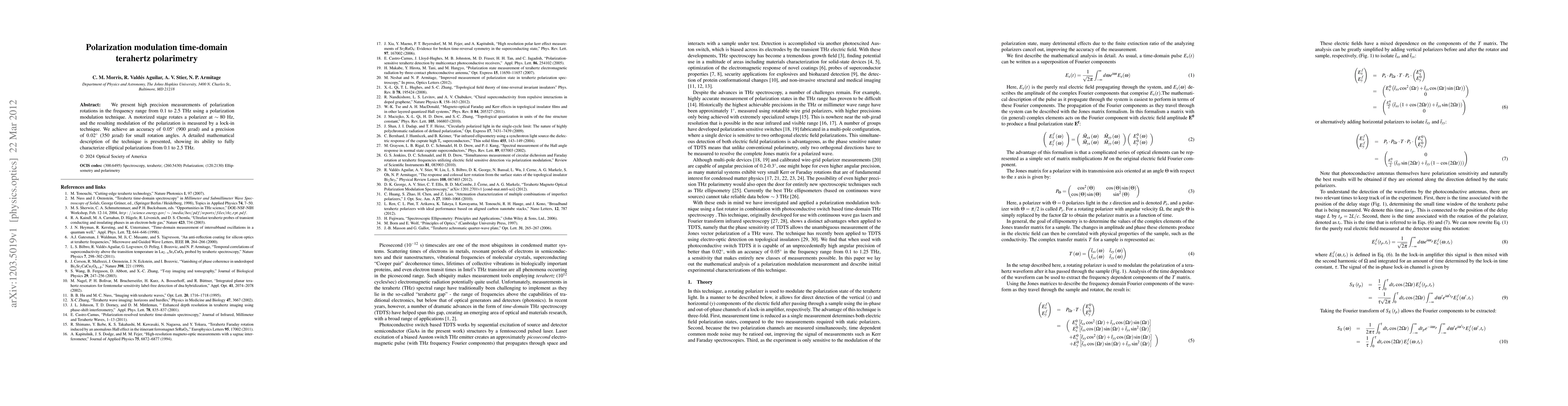 We present high precision measurements of polarization rotations in the frequency range from 0.1 to 2.5 THz using a polarization modulation technique. A motorized stage rotates a polarizer at ~80 Hz, and the resulting modulation of the polarization is measured by a lock-in technique. We achieve an accuracy of 0.05{\deg} (900 {\mu}rad) and a precision of 0.02{\deg} (350 {\mu}rad) for small rotation angles. A detailed mathematical description of the technique is presented, showing its ability to fully characterize elliptical polarizations from 0.1 to 2.5 THz.