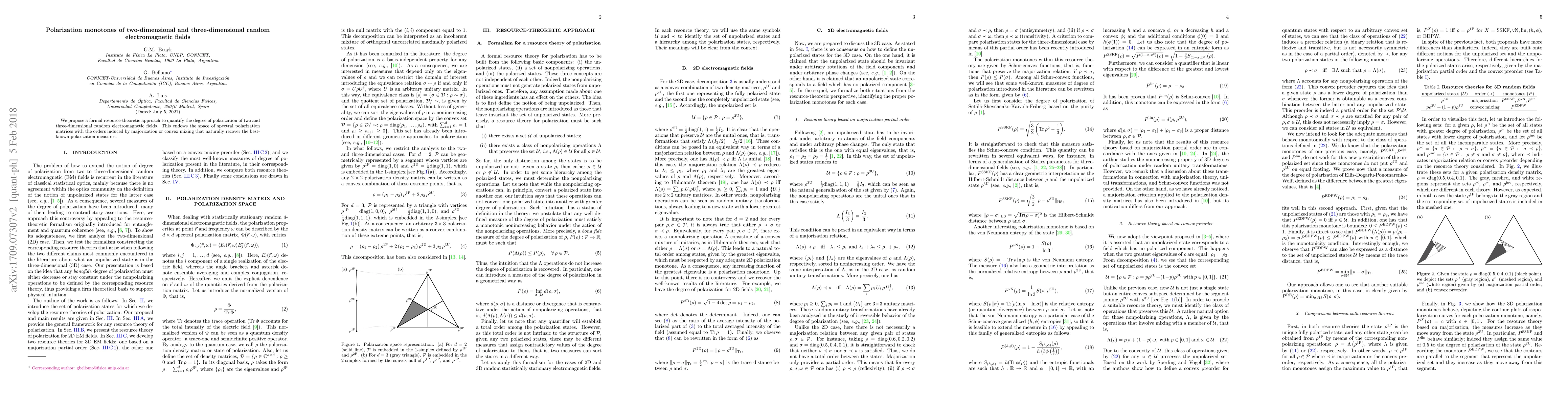 Summary: This paper introduces a resource-theoretic framework to quantify polarization in two- and three-dimensional random electromagnetic fields, utilizing majorization and convex mixing to order spectral polarization matrices and recover established polarization measures.
