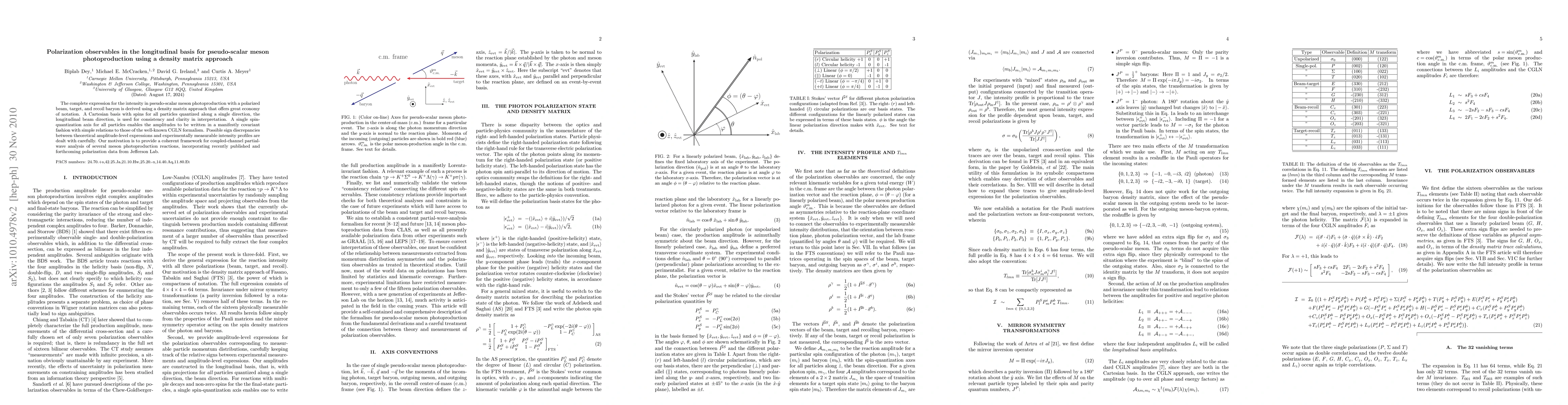 The complete expression for the intensity in pseudo-scalar meson photoproduction with a polarized beam, target, and recoil baryon is derived using a density matrix approach that offers great economy of notation. A Cartesian basis with spins for all particles quantized along a single direction, the longitudinal beam direction, is used for consistency and clarity in interpretation. A single spin-quantization axis for all particles enables the amplitudes to be written in a manifestly covariant fashion with simple relations to those of the well-known CGLN formalism. Possible sign discrepancies between theoretical amplitude-level expressions and experimentally measurable intensity profiles are dealt with carefully. Our motivation is to provide a coherent framework for coupled-channel partial-wave analysis of several meson photoproduction reactions, incorporating recently published and forthcoming polarization data from Jefferson Lab.