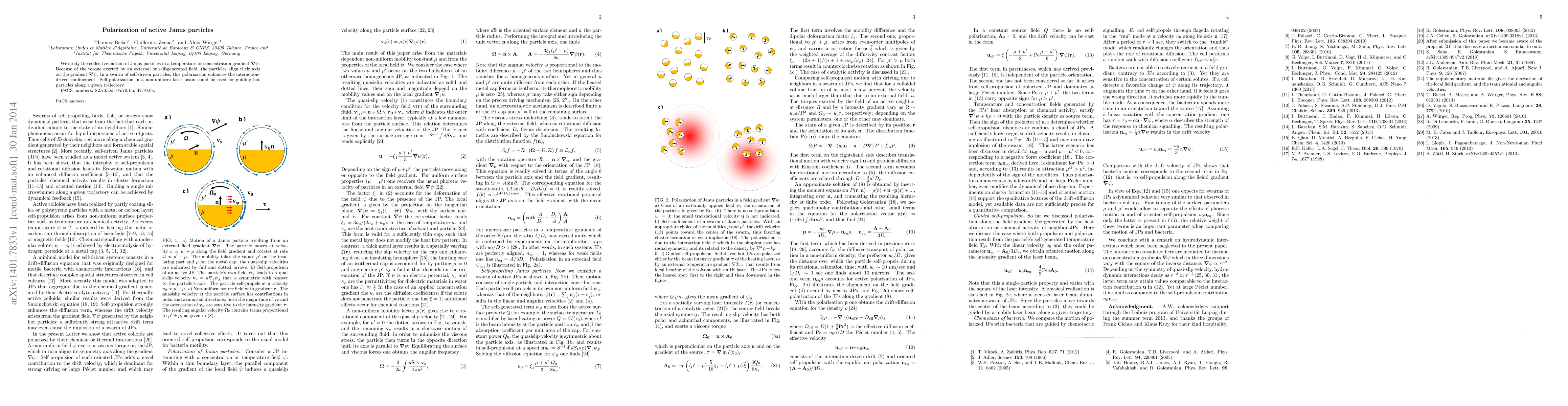We study the collective motion of Janus particles in a temperature or concentration gradient. Because of the torque exerted by an external or self-generated field, the particles align their axis on this gradient. In a swarm of self-driven particles, this polarization enhances the interactiondriven confinement. Self-polarization in a non-uniform laser beam could be used for guiding hot particles along a given trajectory.