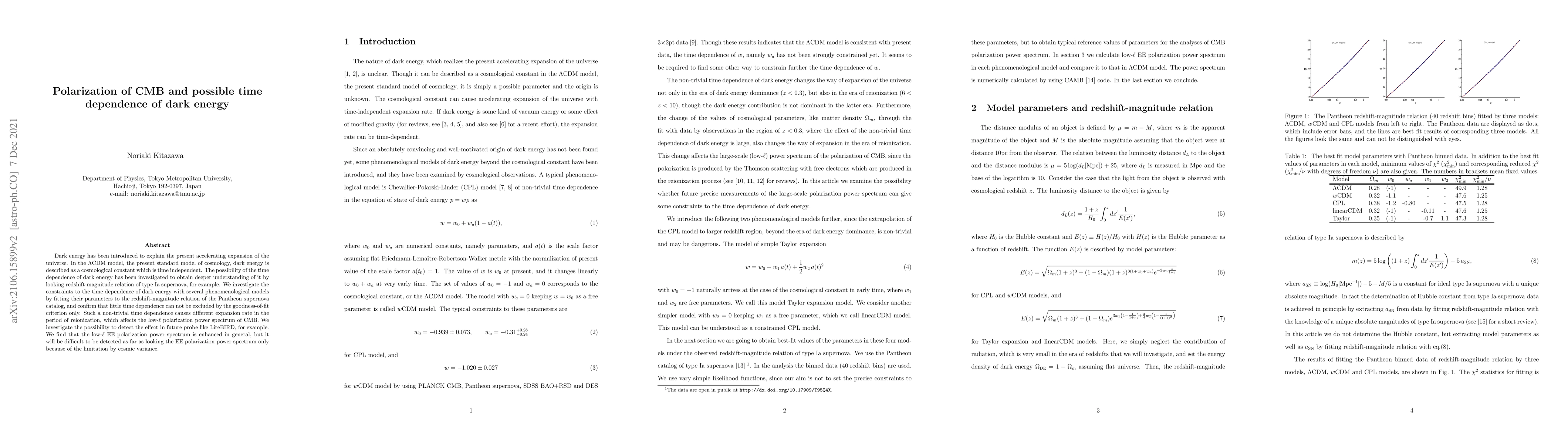 Dark energy has been introduced to explain the present accelerating expansion of the universe. In the LambdaCDM model, the present standard model of cosmology, dark energy is described as a cosmological constant which is time independent. The possibility of the time dependence of dark energy has been investigated to obtain deeper understanding of it by looking redshit-magnitude relation of type Ia supernova, for example. We investigate the constraints to the time dependence of dark energy with several phenomenological models by fitting their parameters to the redshit-magnitude relation of the Pantheon supernova catalog, and confirm that little time dependence can not be excluded by the goodness-of-fit criterion only. Such a non-trivial time dependence causes different expansion rate in the period of reionization, which affects the low-l polarization power spectrum of CMB. We investigate the possibility to detect the effect in future probe like LiteBIRD, for example. We find that the low-l EE polarization power spectrum is enhanced in general, but it will be difficult to be detected as far as looking the EE polarization power spectrum only because of the limitation by cosmic variance.