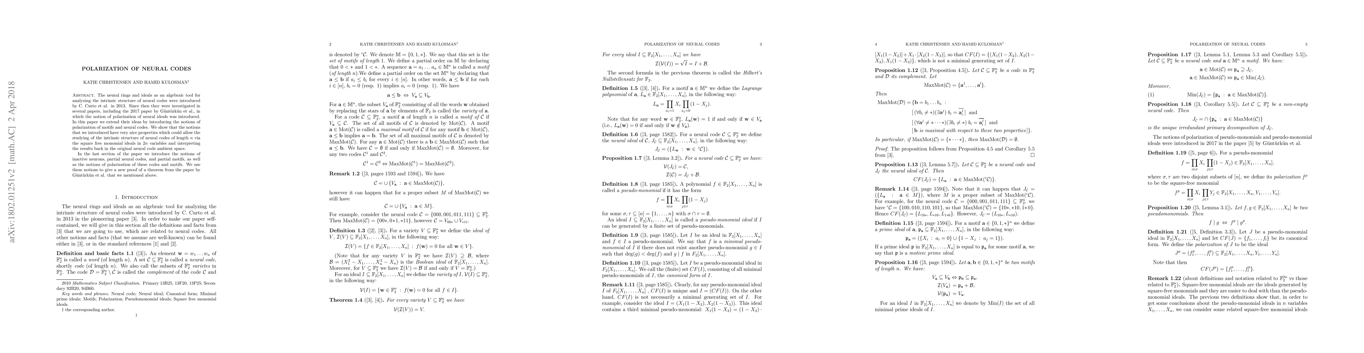 This paper extends the algebraic framework for analyzing neural codes by introducing the notions of polarization of motifs and neural codes. It demonstrates that these new concepts allow for the study of neural codes' intrinsic structure using square free monomial ideals, providing a new proof of a theorem from a prior study.
