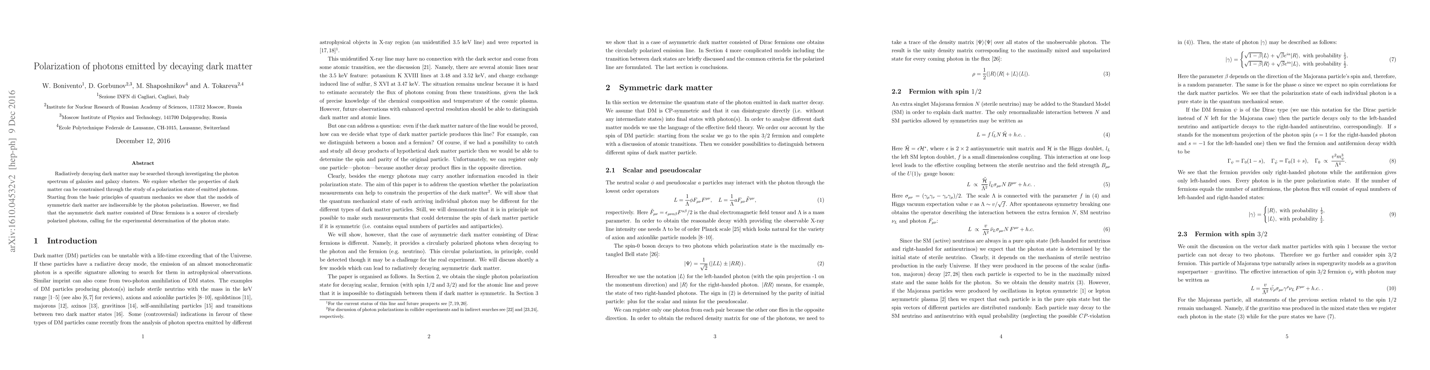 Radiatively decaying dark matter may be searched through investigating the photon spectrum of galaxies and galaxy clusters. We explore whether the properties of dark matter can be constrained through the study of a polarization state of emitted photons. Starting from the basic principles of quantum mechanics we show that the models of symmetric dark matter are indiscernible by the photon polarization. However, we find that the asymmetric dark matter consisted of Dirac fermions is a source of circularly polarized photons, calling for the experimental determination of the photon state.