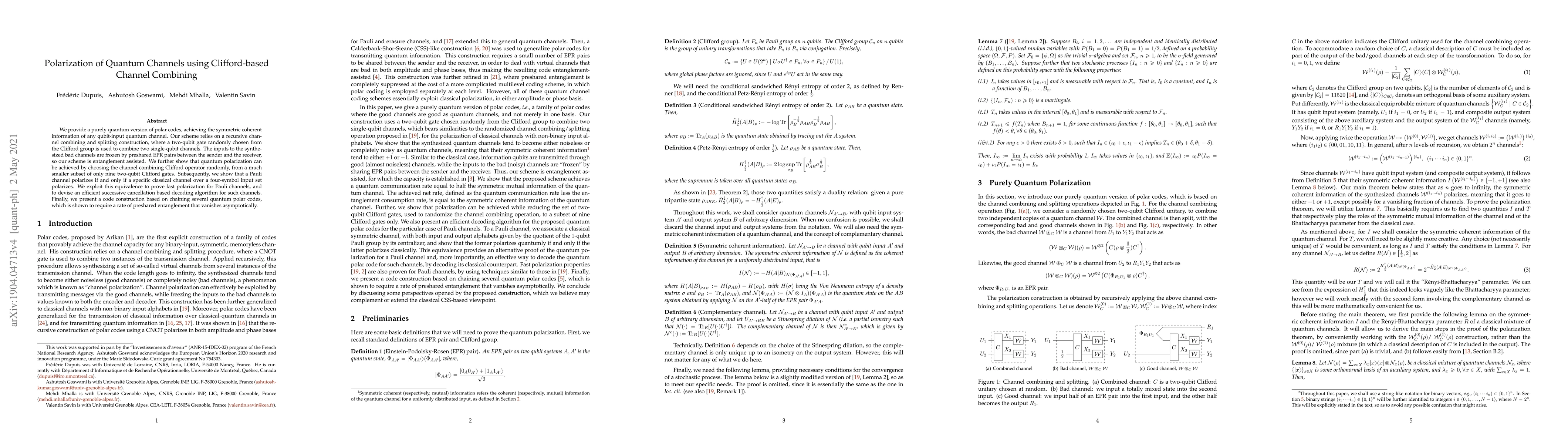 This paper introduces a quantum version of polar codes that achieves optimal coherent information for qubit-input quantum channels through recursive channel combining using Clifford group gates. It demonstrates polarization using a subset of nine Clifford gates and presents a decoding algorithm and a code construction that requires vanishing entanglement as the channel size increases.