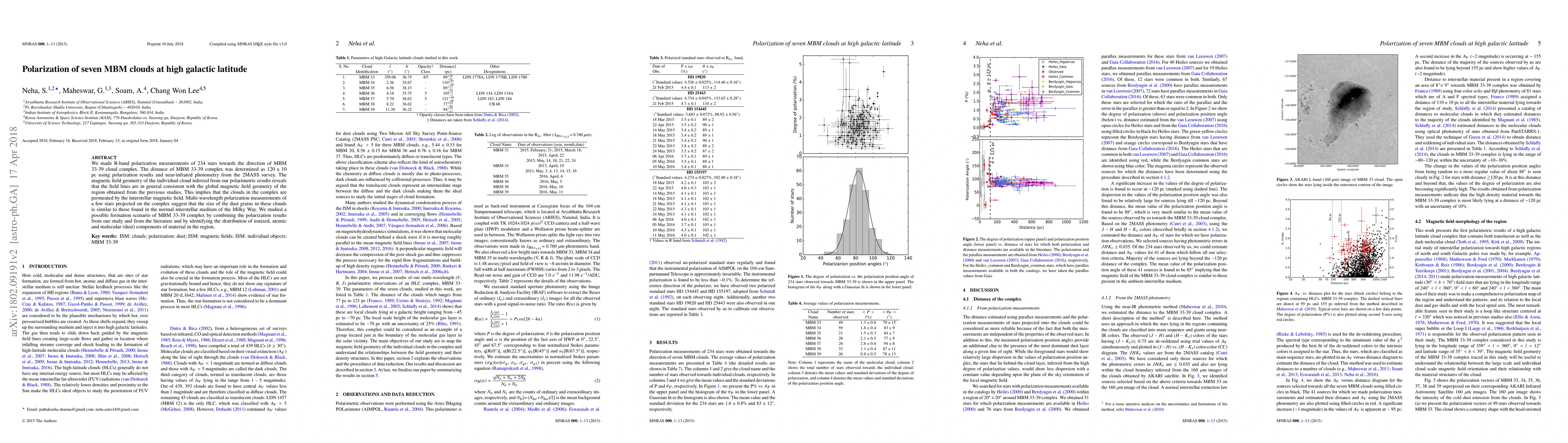 We made R-band polarization measurements of 234 stars towards the direction of MBM 33-39 cloud complex. The distance of MBM 33-39 complex was determined as $120\pm10$ pc using polarization results and near-infrared photometry from the 2MASS survey. The magnetic field geometry of the individual cloud inferred from our polarimetric results reveals that the field lines are in general consistent with the global magnetic field geometry of the region obtained from the previous studies. This implies that the clouds in the complex are permeated by the interstellar magnetic field. Multi-wavelength polarization measurements of a few stars projected on the complex suggest that the size of the dust grains in these clouds is similar to those found in the normal interstellar medium of the Milky Way. We studied a possible formation scenario of MBM 33-39 complex by combining the polarization results from our study and from the literature and by identifying the distribution of ionized, atomic and molecular (dust) components of material in the region.