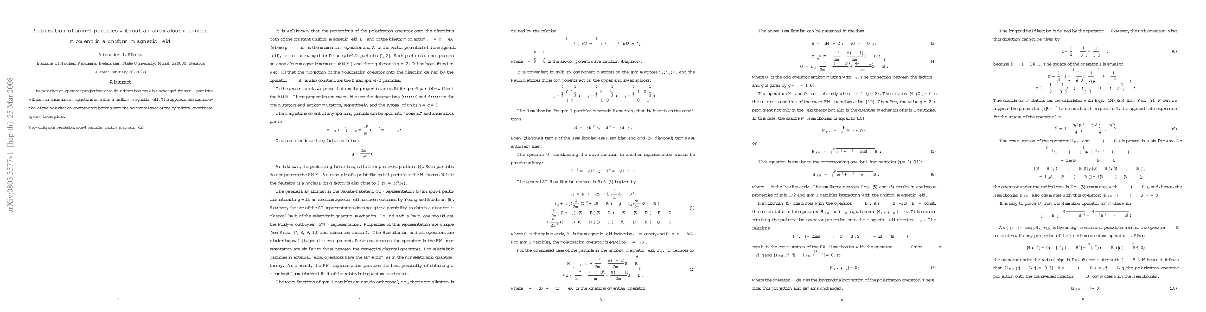 Summary: This paper investigates spin-1 particles without an anomalous magnetic moment in a uniform magnetic field, finding that their polarization operator projections onto four specific directions remain unchanged, with approximate conservation along the horizontal axes of a cylindrical coordinate system.