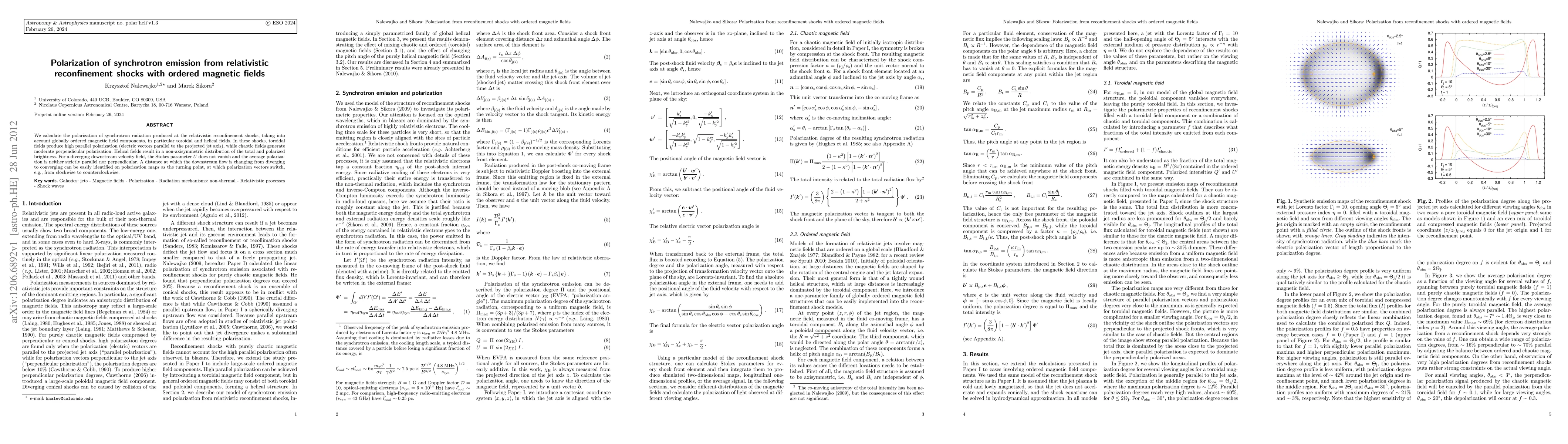 This paper investigates the polarization of synchrotron emission from relativistic reconfinement shocks, revealing that toroidal fields cause high parallel polarization, while helical fields generate non-axisymmetric brightness distributions. The study identifies a turning point in polarization maps where the downstream flow transitions from diverging to converging.