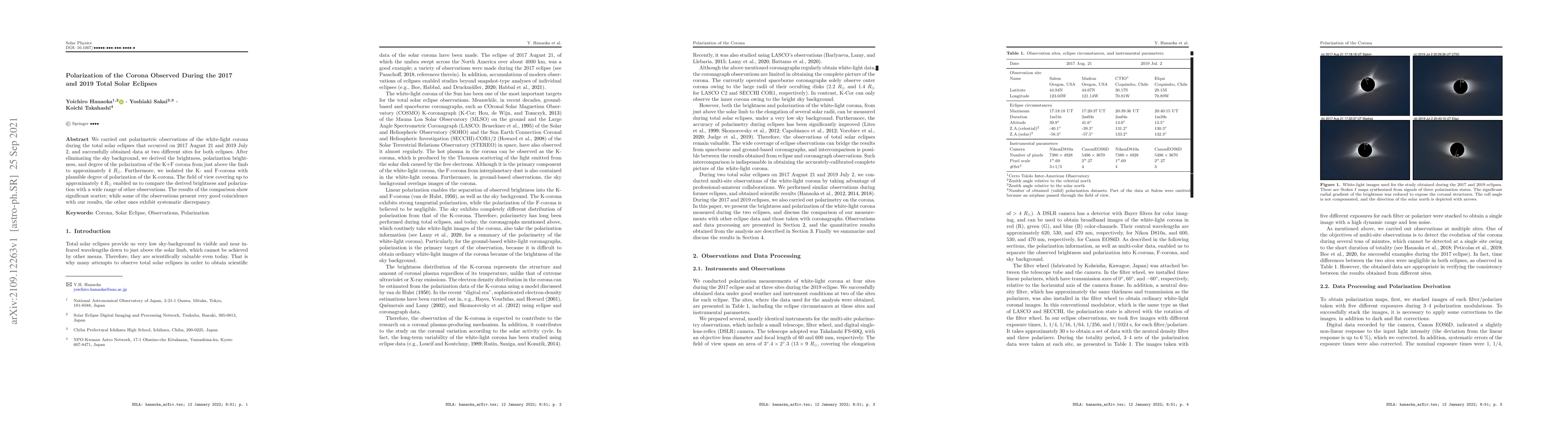 This study conducted polarimetric observations of the white-light corona during the 2017 and 2019 total solar eclipses, deriving brightness and polarization data up to 4 $R_\odot$. Comparisons with other observations reveal significant discrepancies, indicating variability in coronal polarization characteristics.