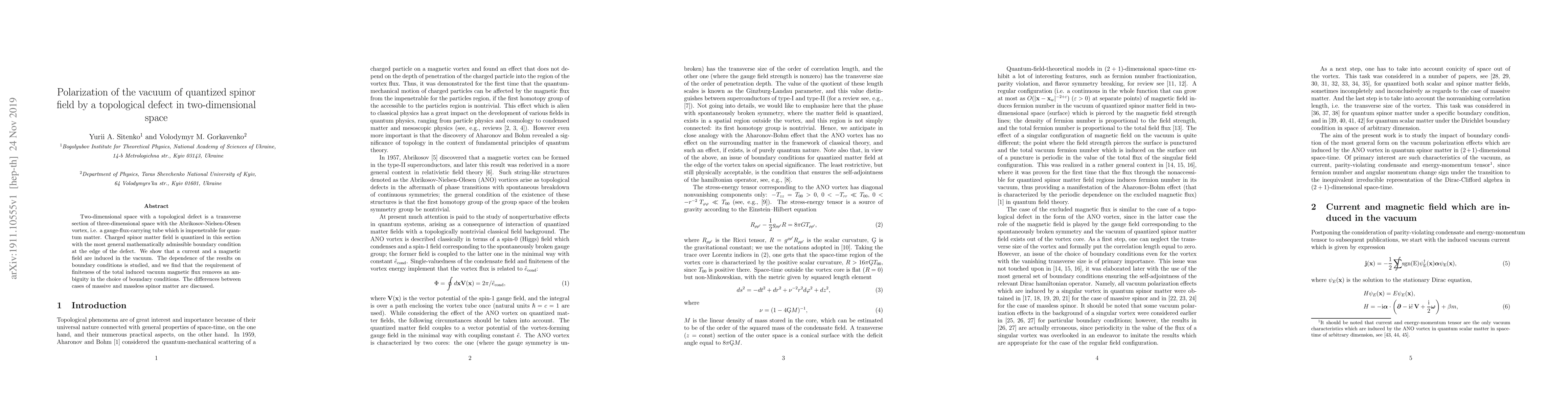 A topological defect in 2D space induces a magnetic field and current in the vacuum of a quantized spinor field, with the choice of boundary conditions resolved through finiteness constraints.