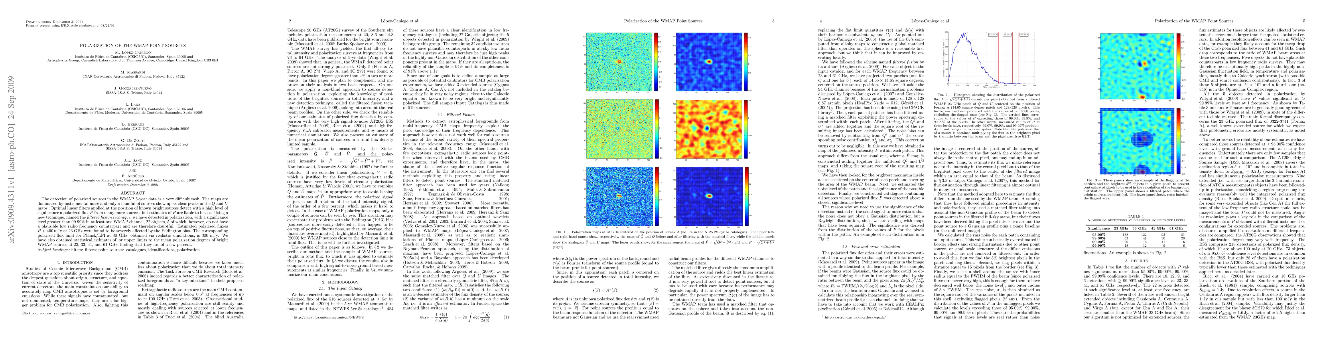 The WMAP 5-year data reveals polarized sources using optimal filters, detecting 22 polarized objects with a 99.99% confidence level, though 5 lack plausible radio frequency counterparts. Estimated polarized fluxes are limited by Eddington bias, with a future limit of 300 mJy for Planck/LFI at 30 GHz.