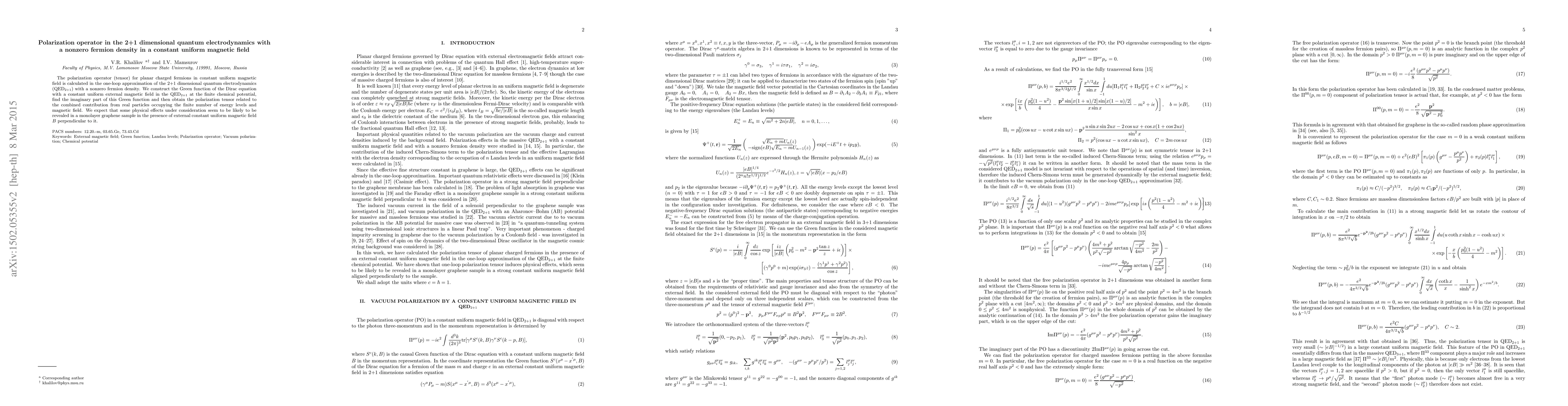 This paper calculates the polarization operator in 2+1 dimensional quantum electrodynamics (QED$_{2+1}$) for charged fermions in a constant magnetic field, considering a nonzero fermion density. The study uses the one-loop approximation to derive the polarization tensor, revealing physical effects potentially observable in monolayer graphene under a perpendicular magnetic field.