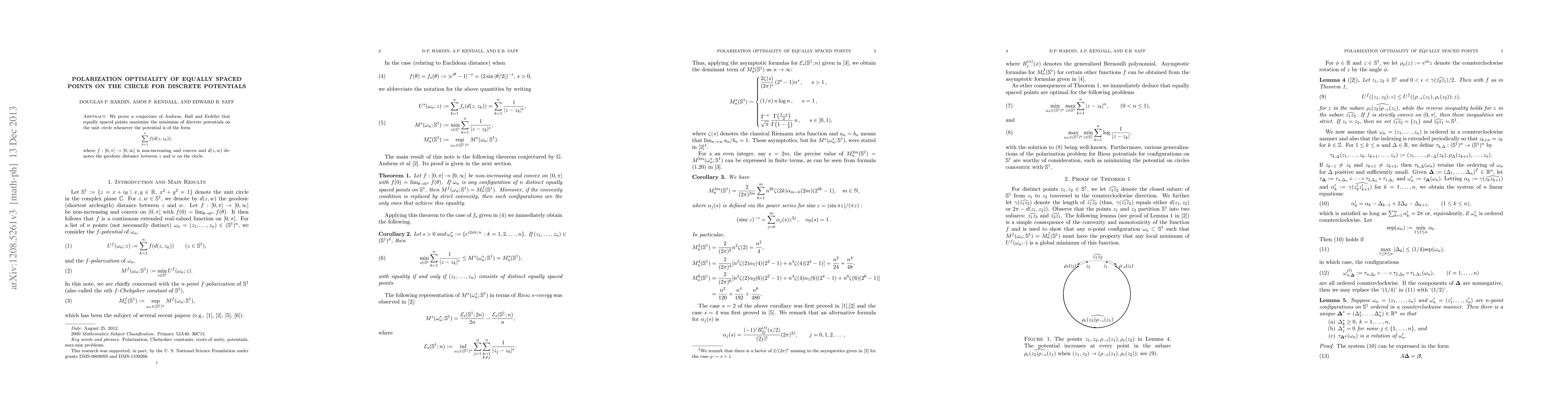 This paper proves that equally spaced points on the unit circle maximize the minimum of discrete potentials under specific conditions, confirming a conjecture by Ambrus, Ball, and Erdőlyi. The potentials are defined as sums of non-increasing, strictly convex functions of geodesic distances between points.