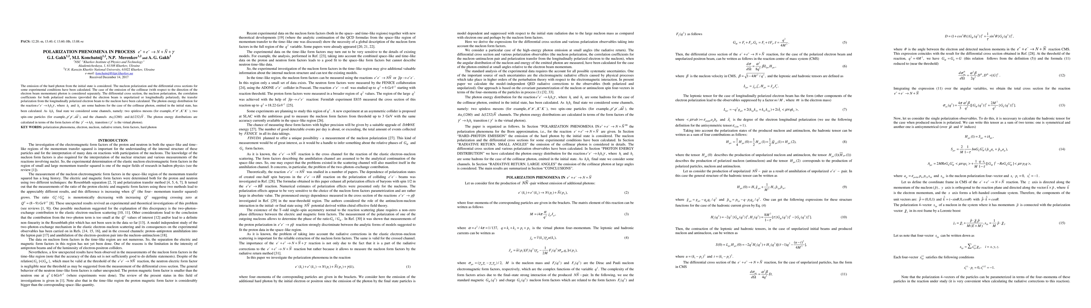 The emission of the hard photon by the initial state is considered. The nucleon polarization and the differential cross sections for some experimental conditions have been calculated. The case of the emission of the collinear (with respect to the direction of the electron beam momentum) photon is considered separately. The differential cross section, the nucleon polarization, the correlation coefficients for both polarized nucleons (provided the electron beam is unpolarized or longitudinally polarized), the transfer polarization from the longitudinally polarized electron beam to the nucleon have been calculated. The photon energy distribution for the reaction $e^+e^-\to h_1h_2\gamma $, where $h_1 $ and $h_2$ are some hadrons for the case of the collinear photon, emitted in the initial state, has been calculated. As $h_1h_2$ final state we considered some channels, namely: two spinless mesons (for example, $\pi^+\pi^-, K^+K^-$), two spin--one particles (for example, $\rho^+\rho^-, d\bar d$), the $\pi a_1(1260)$ and $\Delta(1232)\bar N$ channels. The photon energy distributions are calculated in terms of the form factors of the $\gamma^*\to h_1h_2$ transition ($\gamma^*$ is the virtual photon).