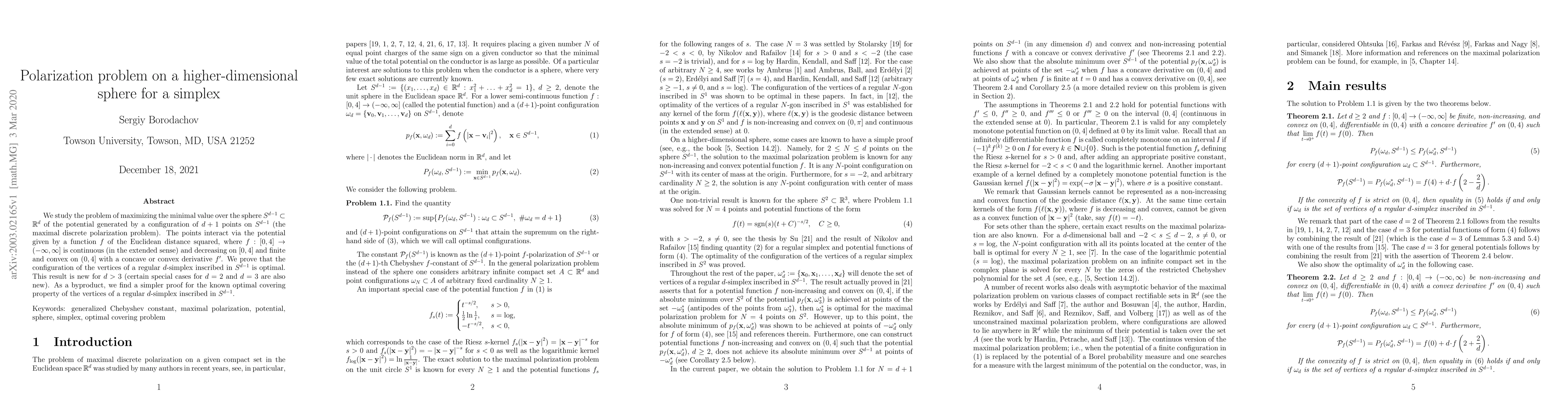 Researchers prove that a regular d-simplex inscribed in a d-dimensional sphere maximizes the minimal potential generated by d+1 points on its surface for certain conditions, offering new findings for dimensions greater than 3.
