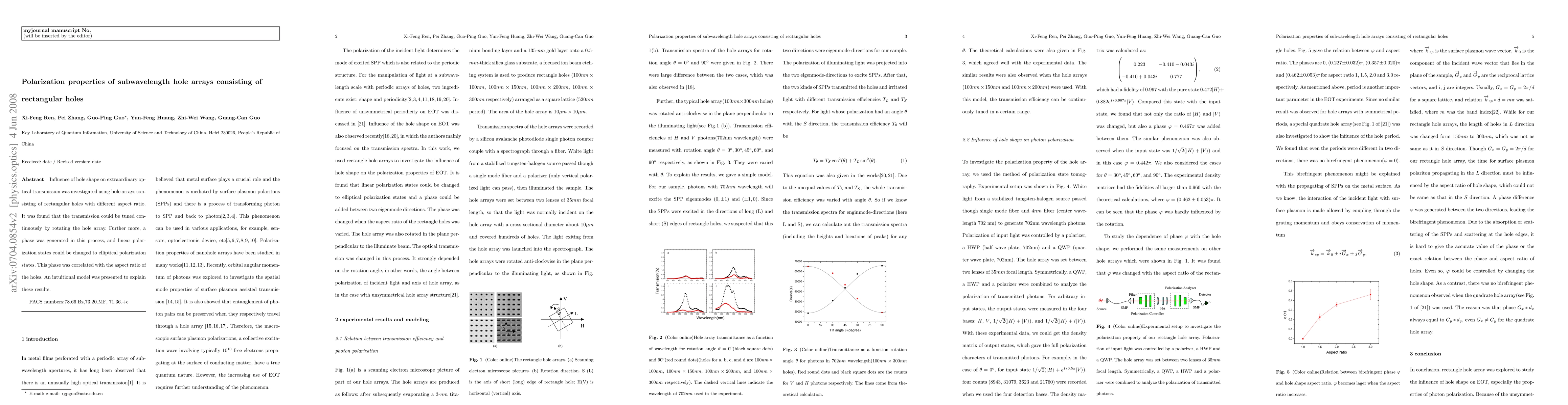 Research on rectangular hole arrays showed that rotating the array can tune polarization states from linear to elliptical and generate a phase correlated with aspect ratio. This effect allows for continuous control of extraordinary optical transmission.