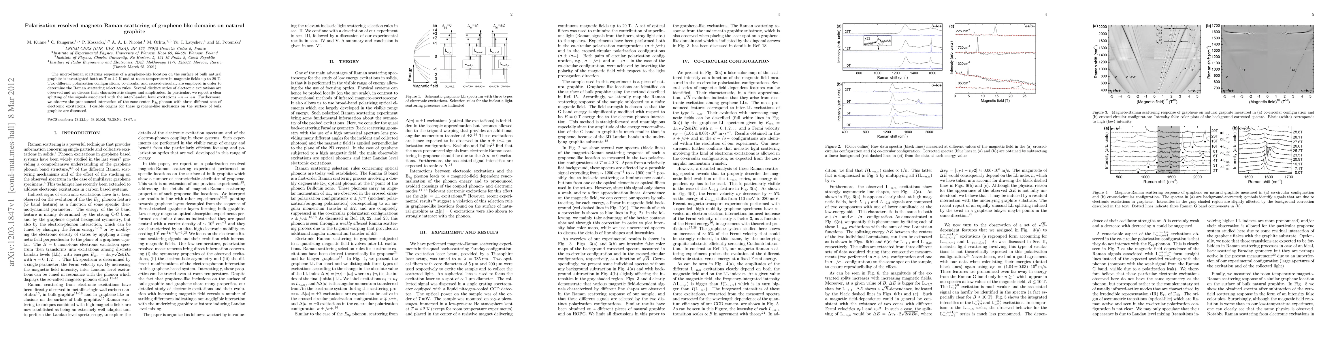 This study investigates the polarization-resolved magneto-Raman scattering of graphene-like domains on natural graphite, revealing distinct electronic excitation series and clear splitting of inter-Landau level signals, along with interactions between the E$_{\text{2g}}$-phonon and electronic excitations. The origins of these graphene-like inclusions are also discussed.