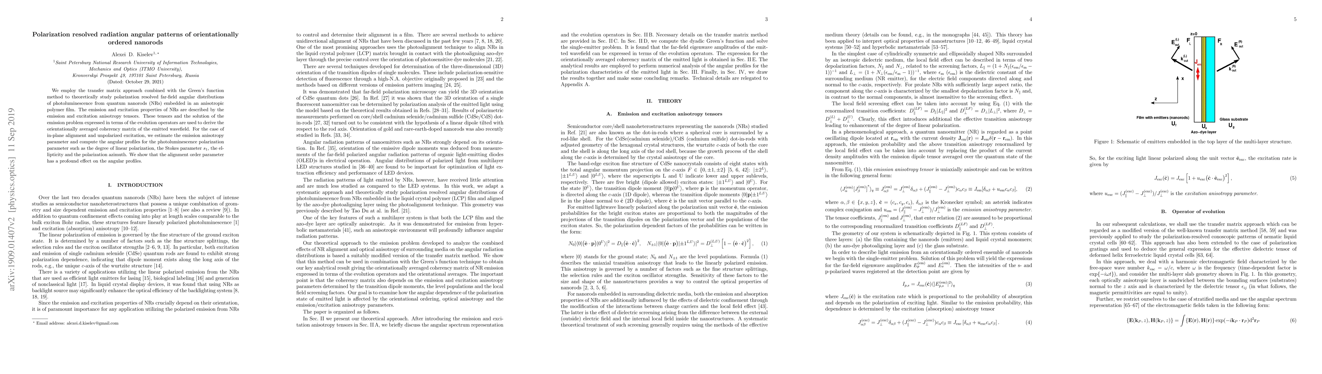 We employ the transfer matrix approach combined with the Green's function method to theoretically study polarization resolved far-field angular distributions of photoluminescence from quantum nanorods (NRs) embedded in an anisotropic polymer film. The emission and excitation properties of NRs are described by the emission and excitation anisotropy tensors. These tensors and the solution of the emission problem expressed in terms of the evolution operators are used to derive the orientationally averaged coherency matrix of the emitted wavefield. For the case of in-plane alignment and unpolarized excitation, we estimate the emission anisotropy parameter and compute the angular profiles for the photoluminescence polarization parameter such as the degree of linear polarization, the Stokes parameter $s_1$, the ellipticity and the polarization azimuth. We show that the alignment order parameter has a profound effect on the angular profiles.