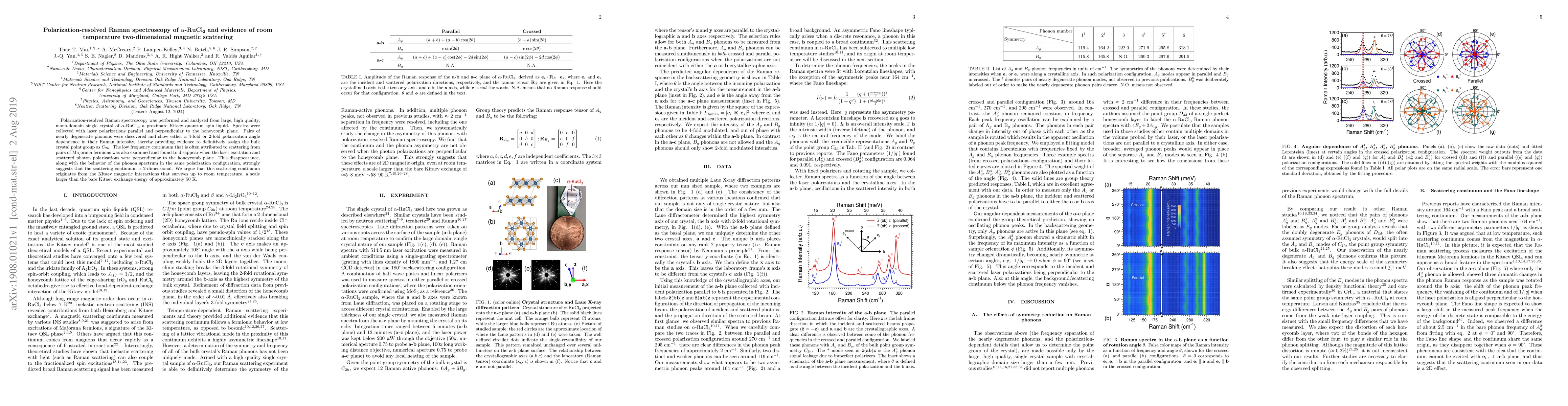 Polarization-resolved Raman spectroscopy was performed and analyzed from large, high quality, mono-domain single crystal of {\alpha}-RuCl3, a proximate Kitaev quantum spin liquid. Spectra were collected with laser polarizations parallel and perpendicular to the honeycomb plane. Pairs of nearly degenerate phonons were discovered and show either a 4-fold or 2-fold polarization angle dependence in their Raman intensity, thereby providing evidence to definitively assign the bulk crystal point group as C2h. The low frequency continuum that is often attributed to scattering from pairs of Majorana fermions was also examined and found to disappear when the laser excitation and scattered photon polarizations were perpendicular to the honeycomb plane. This disappearance, along with the behavior of the phonon spectrum in the same polarization configuration, strongly suggests that the scattering continuum is 2-dimensional. We argue that this scattering continuum originates from the Kitaev magnetic interactions that survives up to room temperature, a scale larger than the bare Kitaev exchange energy of approximately 50 K.