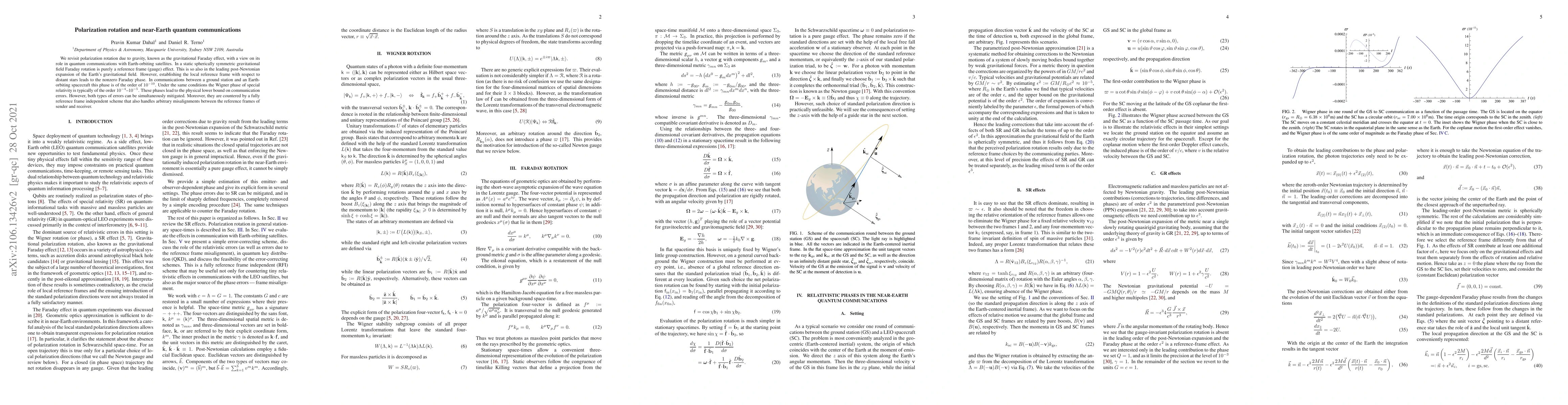 We revisit polarization rotation due to gravity, known as the gravitational Faraday effect, with a view on its role in quantum communications with Earth-orbiting satellites. In a static spherically symmetric gravitational field Faraday rotation is purely a reference frame (gauge) effect. This is so also in the leading post-Newtonian expansion of the Earth's gravitational field. However, establishing the local reference frame with respect to distant stars leads to the nonzero Faraday phase. In communications between a ground station and an Earth-orbiting spacecraft this phase is of the order of 10^-10. Under the same conditions the Wigner phase of special relativity is typically of the order 10^-4--10^-5. These phases lead to the physical lower bound on communication errors. However, both types of errors can be simultaneously mitigated. Moreover, they are countered by a fully reference frame independent scheme that also handles arbitrary misalignment between the reference frames of sender and receiver.