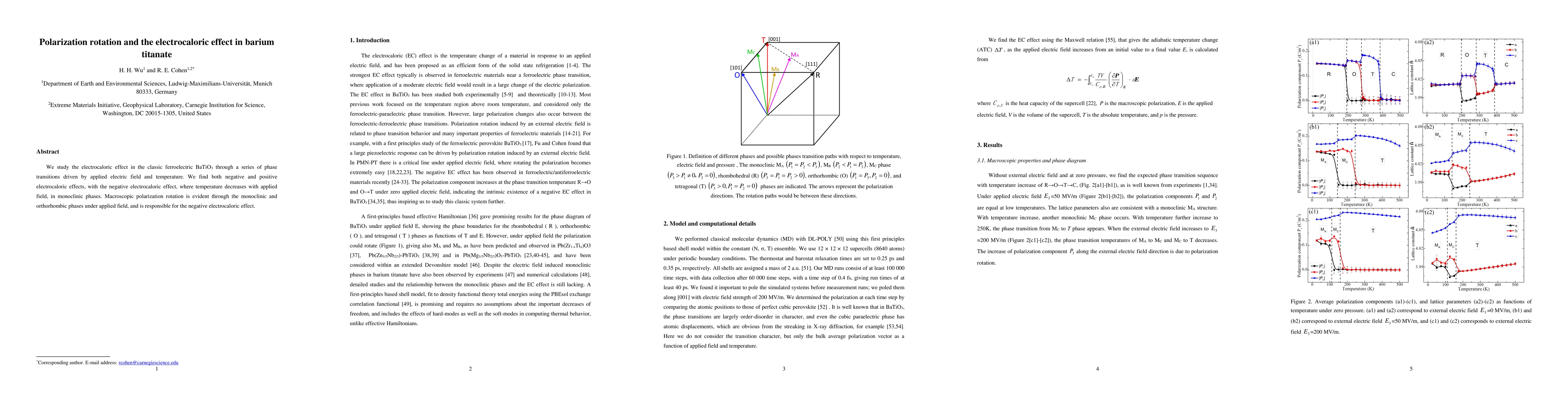 This study investigates the electrocaloric effect in ferroelectric BaTiO3, revealing both negative and positive effects linked to temperature changes under applied electric fields. The negative effect, observed in monoclinic phases, is attributed to macroscopic polarization rotation, which decreases temperature with field application.