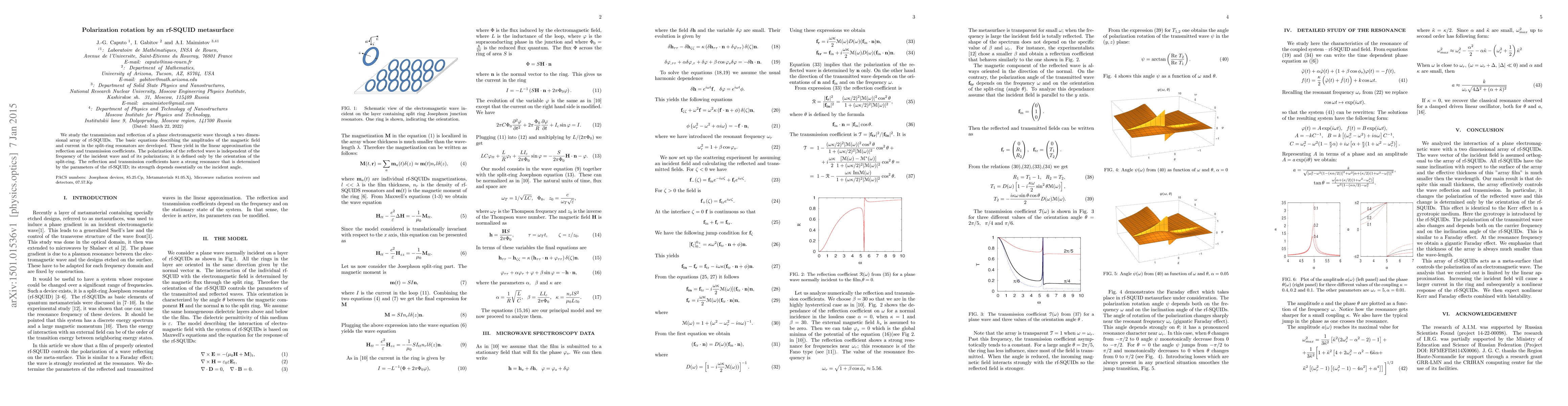 This paper investigates the polarization rotation of electromagnetic waves through an array of rf-SQUID metasurfaces, revealing that the polarization of reflected waves is determined by the orientation of the split-ring resonators rather than the incident wave's frequency or polarization. The study finds strong resonance in reflection and transmission coefficients, influenced by the incident angle and rf-SQUID parameters.