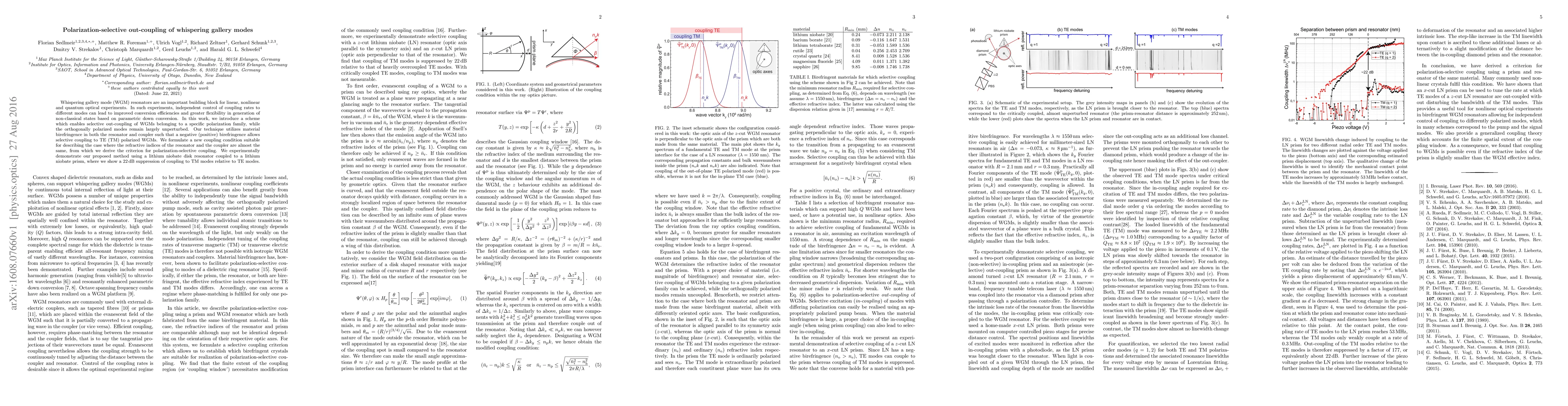 This paper presents a method for polarization-selective out-coupling of whispering gallery modes (WGMs) using material birefringence, achieving 22dB suppression of TM modes relative to TE modes in a lithium niobate disk resonator coupled to a lithium niobate prism. The technique enhances control over coupling rates, improving conversion efficiencies and flexibility in quantum optical experiments.
