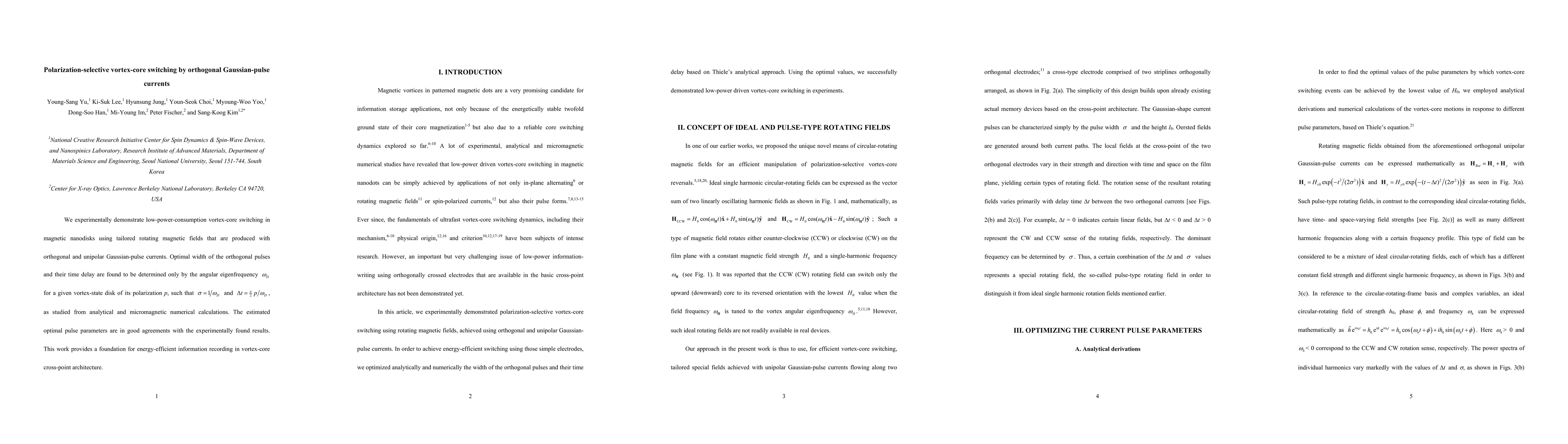This paper demonstrates low-power vortex-core switching in magnetic nanodisks using orthogonal Gaussian-pulse currents, revealing that optimal pulse width and delay depend on the angular eigenfrequency and polarization. The findings support energy-efficient information recording in vortex-core devices.