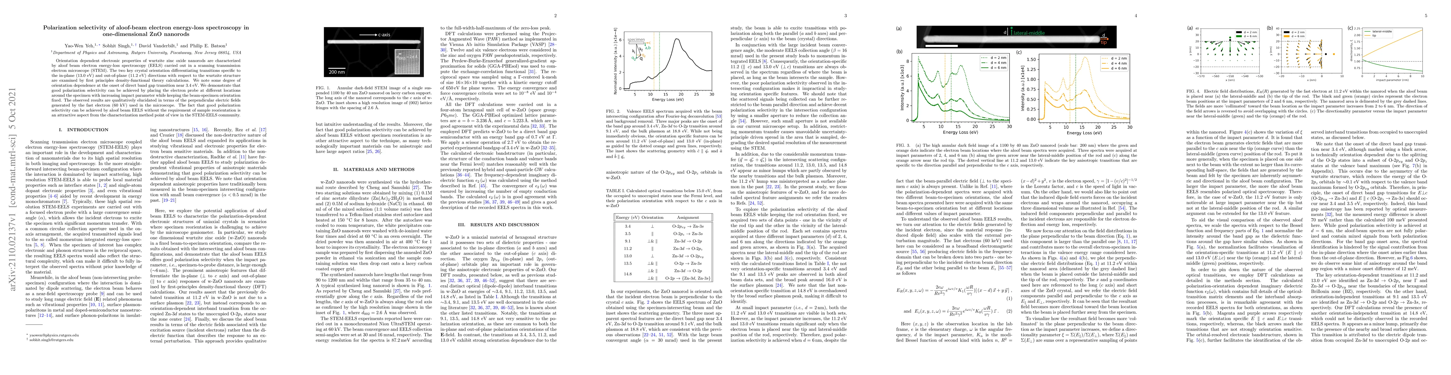 Orientation dependent electronic properties of wurtzite zinc oxide nanorods are characterized by aloof beam electron energy-loss spectroscopy (EELS) carried out in a scanning transmission electron microscope (STEM). The two key crystal orientation differentiating transitions specific to the in-plane (13.0 eV) and out-of-plane (11.2 eV) directions with respect to the wurtzite structure are examined by first principles density-functional theory calculations. We note some degree of orientation dependence at the onset of direct band gap transition near 3.4 eV. We demonstrate that good polarization selectivity can be achieved by placing the electron probe at different locations around the specimen with increasing impact parameter while keeping the beam-specimen orientation fixed. The observed results are qualitatively elucidated in terms of the perpendicular electric fields generated by the fast electron (60 kV) used in the microscope. The fact that good polarization selectivity can be achieved by aloof beam EELS without the requirement of sample reorientation is an attractive aspect from the characterization method point of view in the STEM-EELS community.