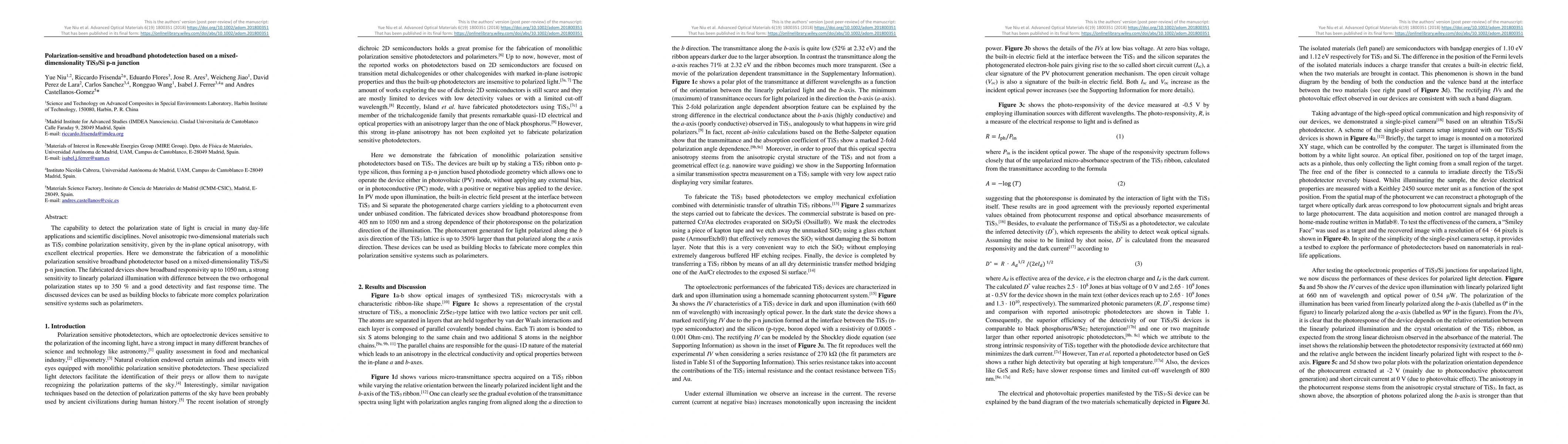 The capability to detect the polarization state of light is crucial in many day-life applications and scientific disciplines. Novel anisotropic two-dimensional materials such as TiS3 combine polarization sensitivity, given by the in-plane optical anisotropy, with excellent electrical properties. Here we demonstrate the fabrication of a monolithic polarization sensitive broadband photodetector based on a mixed-dimensionality TiS3/Si p-n junction. The fabricated devices show broadband responsivity up to 1050 nm, a strong sensitivity to linearly polarized illumination with difference between the two orthogonal polarization states up to 350 % and a good detectivity and fast response time. The discussed devices can be used as building blocks to fabricate more complex polarization sensitive systems such as polarimeters.