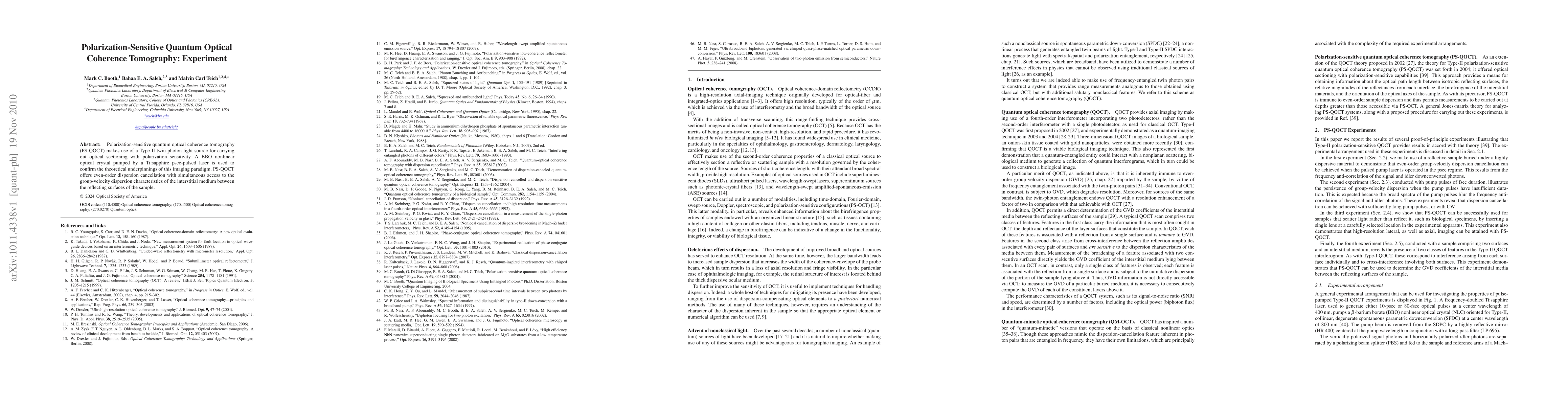 This paper experimentally validates polarization-sensitive quantum optical coherence tomography (PS-QOCT) using a Type-II twin-photon light source and a BBO crystal, demonstrating even-order dispersion cancellation and enhanced group-velocity dispersion characterization.