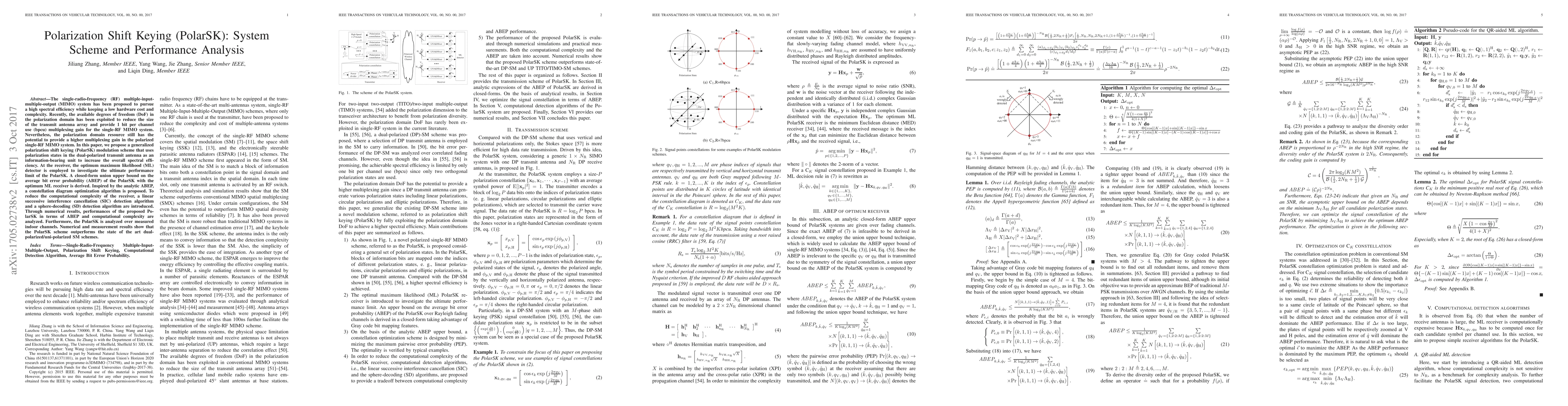 Single-Radio-Frequency (RF) Multiple-Input-Multiple-Output (MIMO) systems such as the spatial modulation (SM) system and the space shift keying (SSK) system have been proposed to pursue a high spectral efficiency while keeping a low cost and complexity transceiver design. Currently, polarization domain resource has been introduced to the single-RF MIMO system to reduce the size of the transmit antenna array and provide 1 bit per channel use (bpcu) multiplexing gain. Nevertheless, the polarization domain resource still has the potential to provide a higher multiplexing gain in the polarized single-RF MIMO system. In this paper, we propose a generalized polarization shift keying (PolarSK) modulation scheme for a SIMO system that uses the polarization states in the dual-polarized transmit antenna as an information-bearing unit to increase the overall spectral efficiency. At the receive end, the maximum likelihood (ML) detector is employed to demodulate the received signal. A closed form union upper bound on the average bit error probability (ABEP) of PolarSK system with the optimum maximum likelihood (ML) receiver is deduced under fading channels. To reduce the computational complexity of the receiver, a linear successive interference cancellation (SIC) detection algorithm and a sphere-decoding (SD) detection algorithm are proposed. On the basis of analytic results and simulations, performances of the proposed PolarSK systems in terms of computational complexity and ABEP are analyzed. Numerical results show that the proposed PolarSK scheme performs better than state of the art dual-polarized/uni-polarized SM schemes.