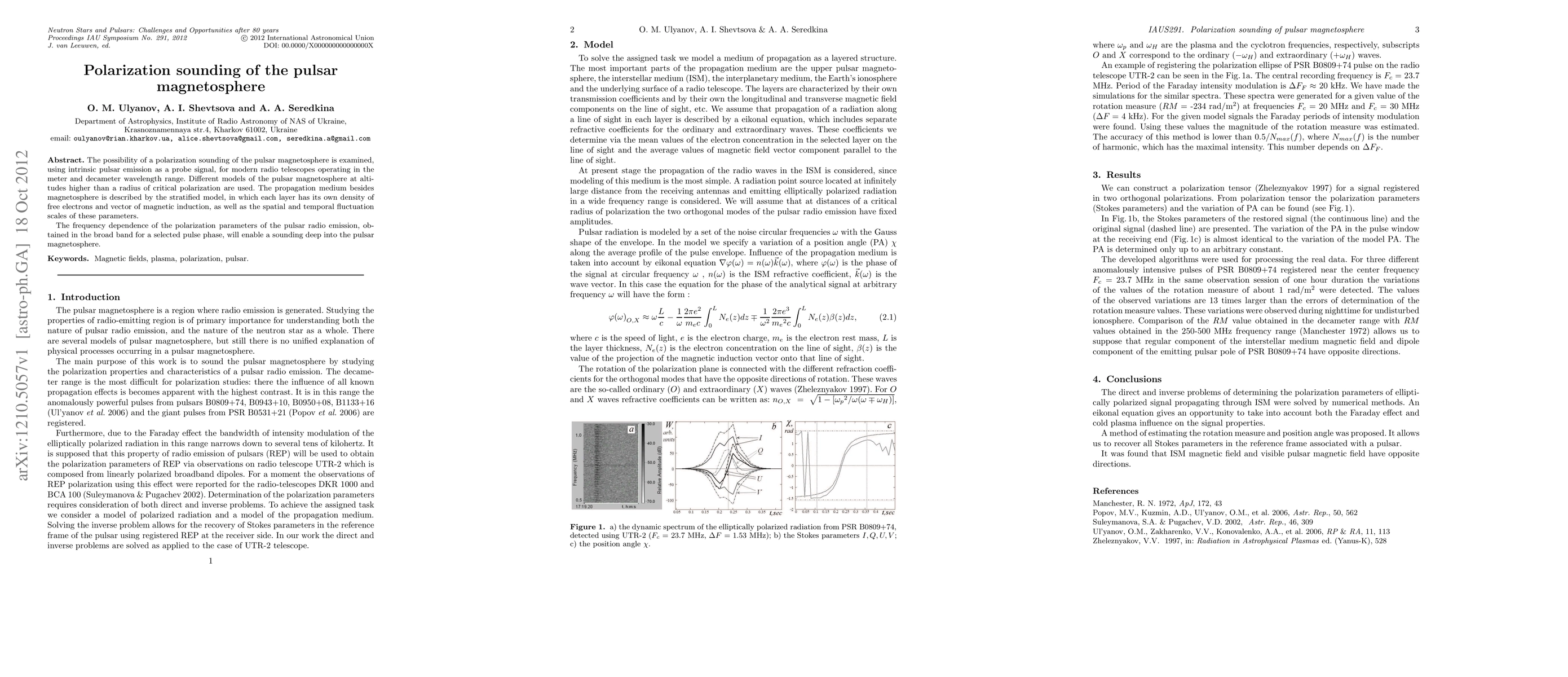 This paper explores the potential of using pulsar intrinsic emission as a probe to sound the pulsar magnetosphere via polarization measurements, employing modern radio telescopes in the meter to decameter wavelength range. The study utilizes different models of the magnetosphere and a stratified medium to analyze the frequency dependence of pulsar radio emission polarization, aiming to gain insights into the magnetosphere's deep structure.