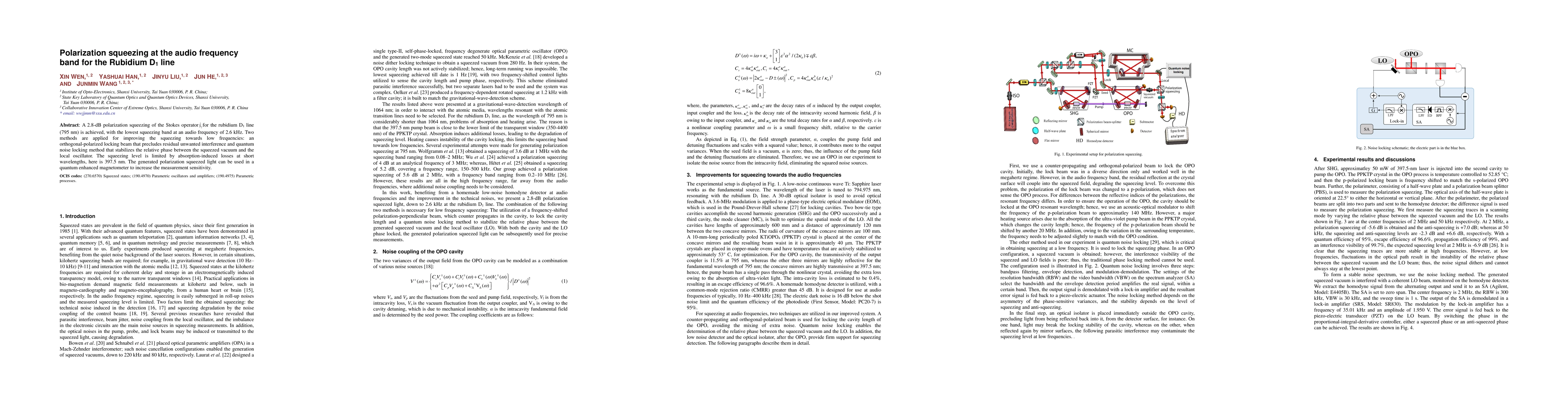 A 2.8-dB polarization squeezing of the Stokes operator S2 for the rubidium D1 line is achieved at an audio frequency of 2.6 kHz, employing orthogonal-polarized locking and quantum noise stabilization methods. This squeezed light can enhance the sensitivity of quantum-enhanced magnetometers.
