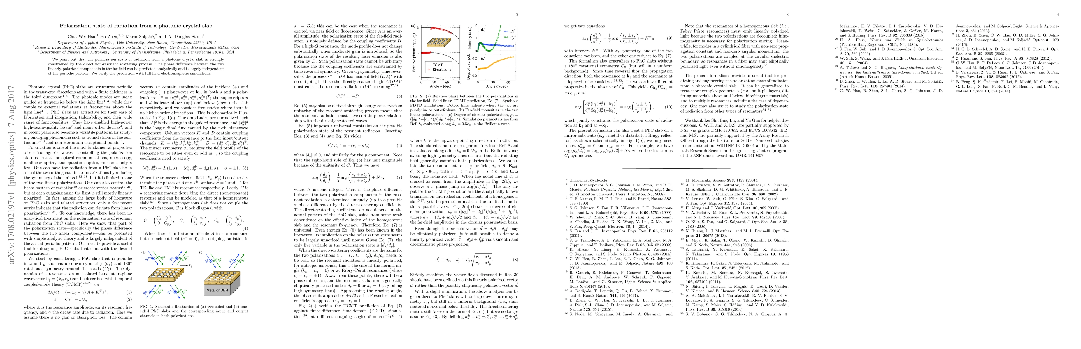 This paper demonstrates that the polarization state of radiation emitted from a photonic crystal slab is significantly influenced by direct non-resonant scattering, with an analytically predictable phase difference between linearly-polarized components, independent of the slab's periodic pattern, as verified by electromagnetic simulations.